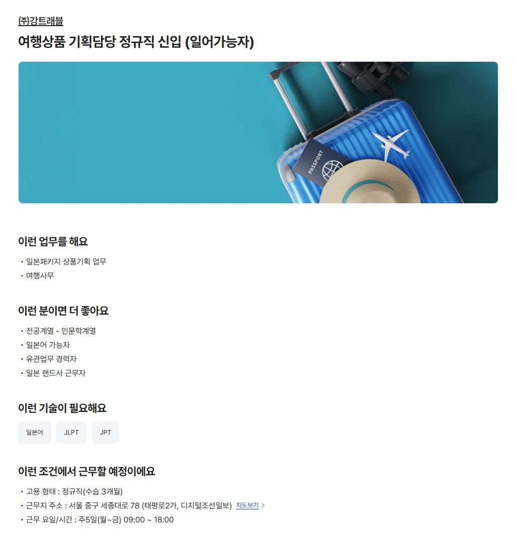 [㈜강트래블] 여행상품 기획담당 정규직 신입 (일어가능자)