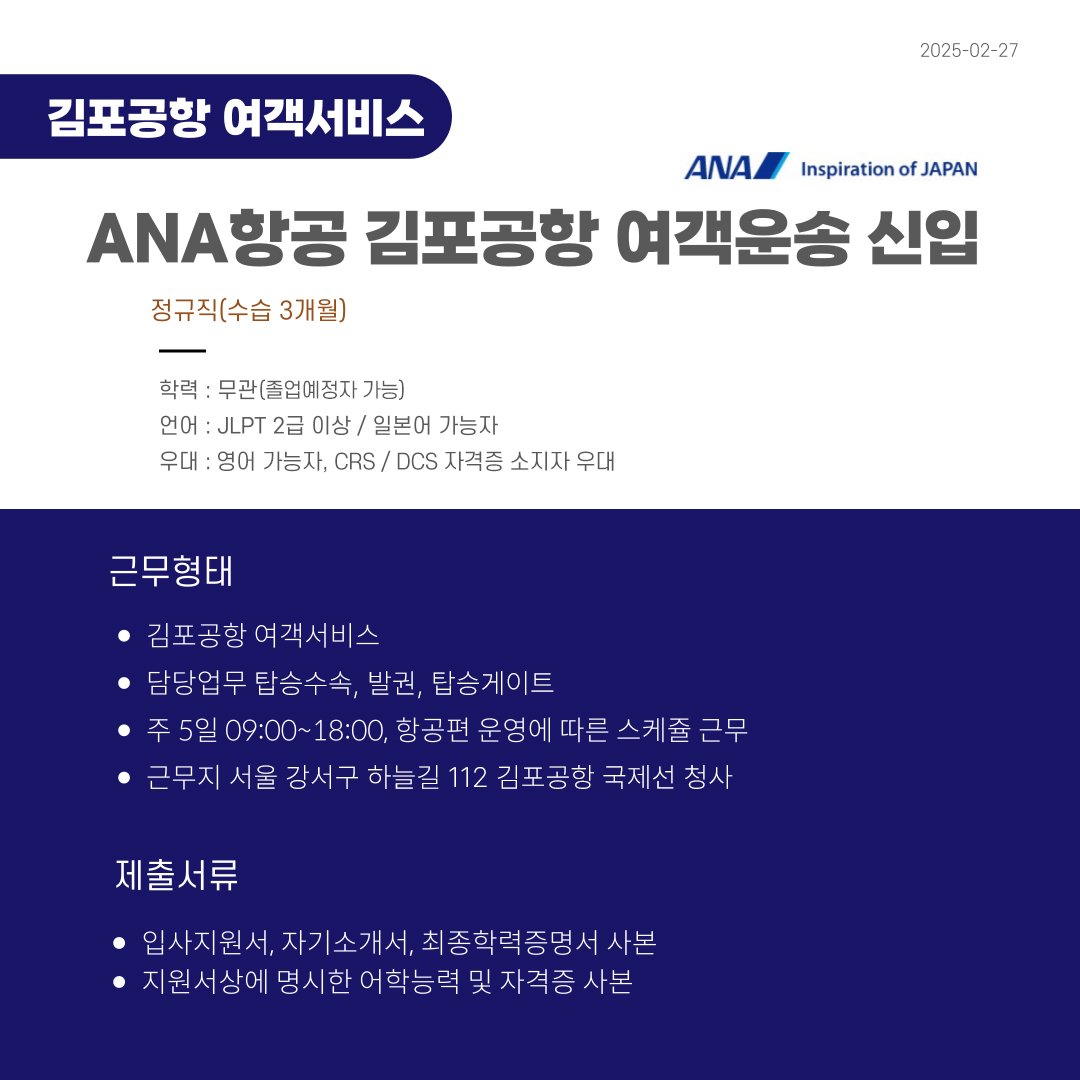 [ANC정회원 추천채용] 일본 ANA항공 김포공항 지상직 채용