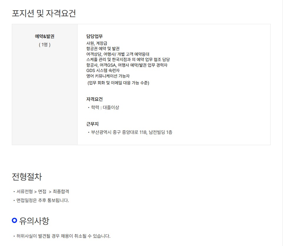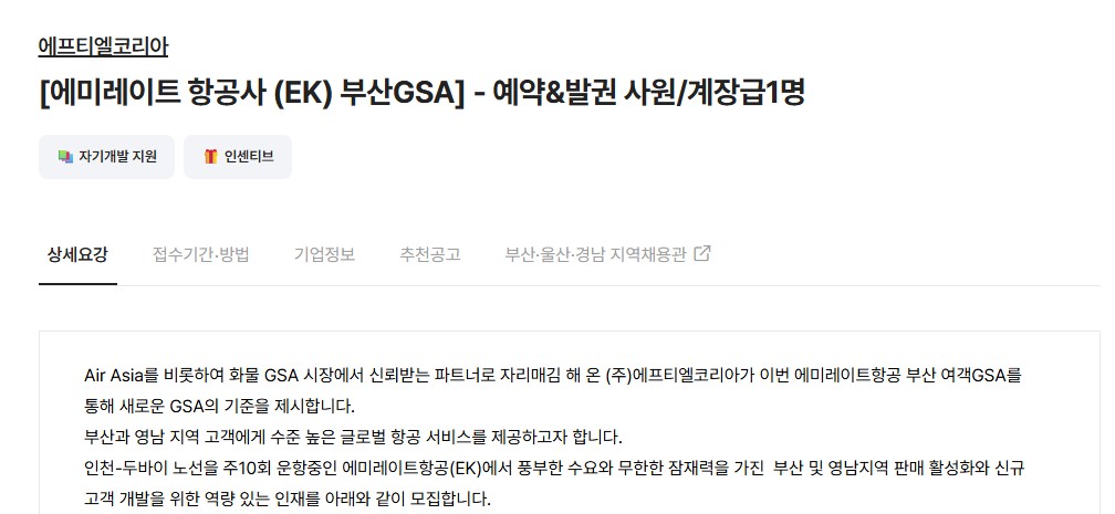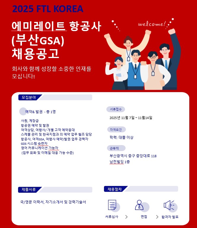 [에미레이트 항공사 (EK) 부산GSA] - 예약&발권 사원/계장급1명 - 경력채용