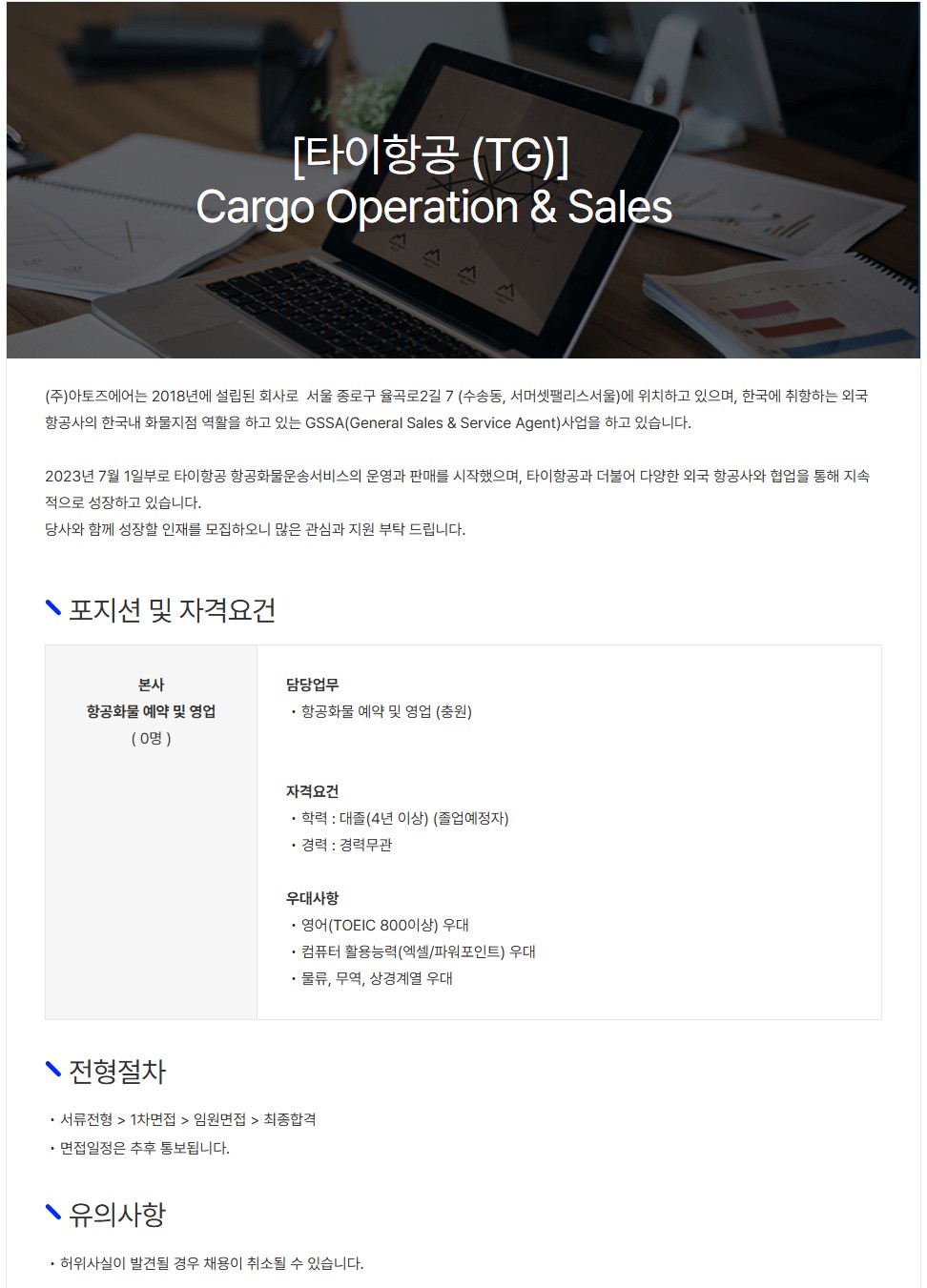 [타이항공(TG)] GSSA 아토즈에어 항공화물 예약 및 영업 (충원)