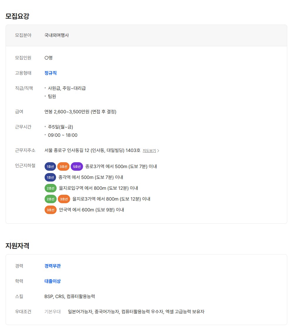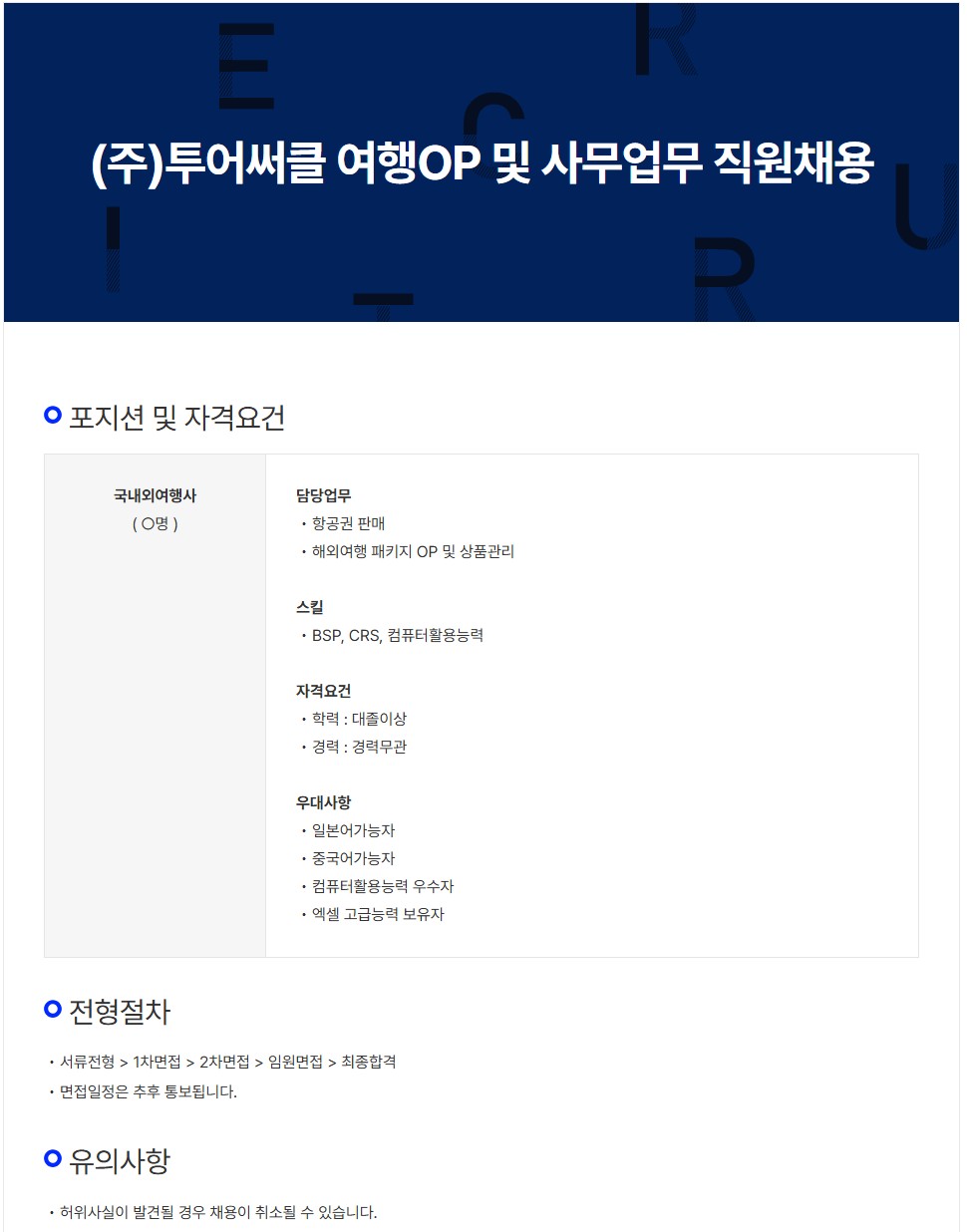 [(주)투어써클] 여행OP 및 사무업무 직원채용
