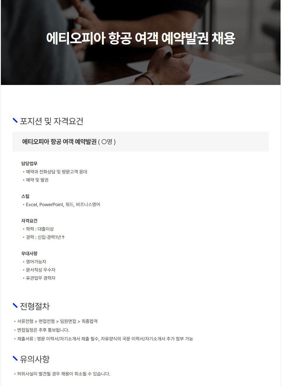 [㈜샤프에비에이션케이] 에티오피아 항공 여객 예약발권 채용