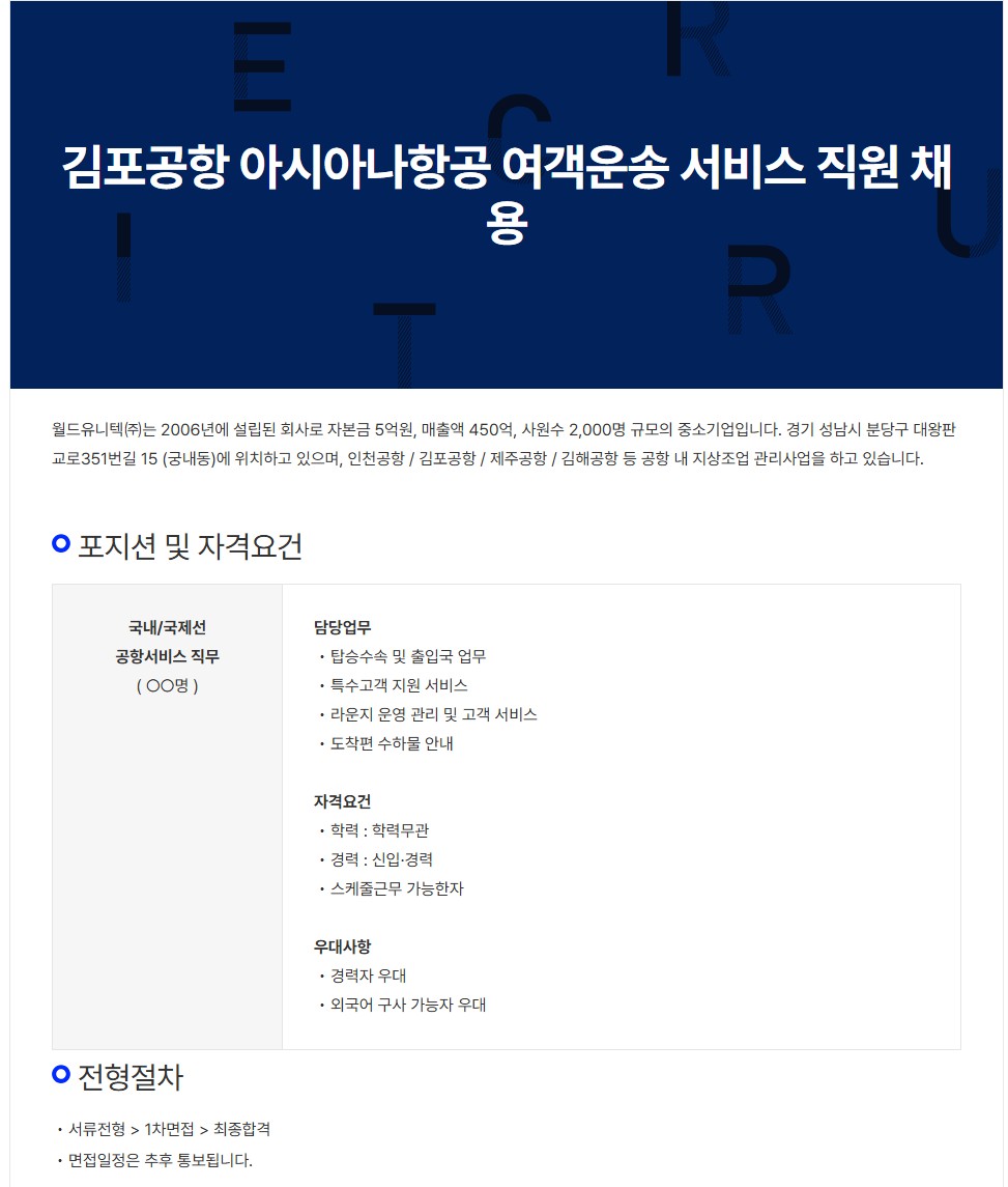 [월드유니텍㈜] 김포공항 아시아나항공 여객운송 서비스 직원 채용