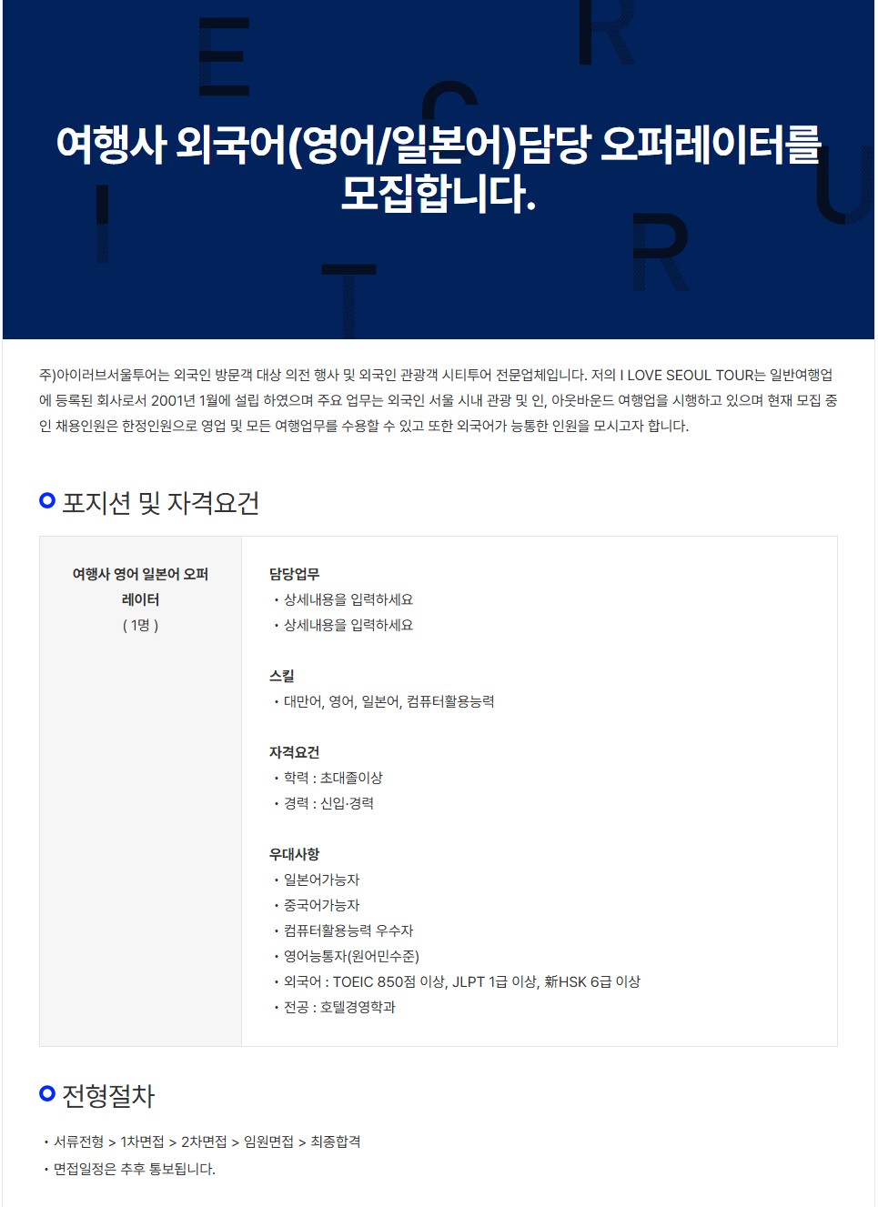 [㈜아이러브 서울투어] 여행사 외국어(영어)담당 오퍼레이터를 모집합니다.