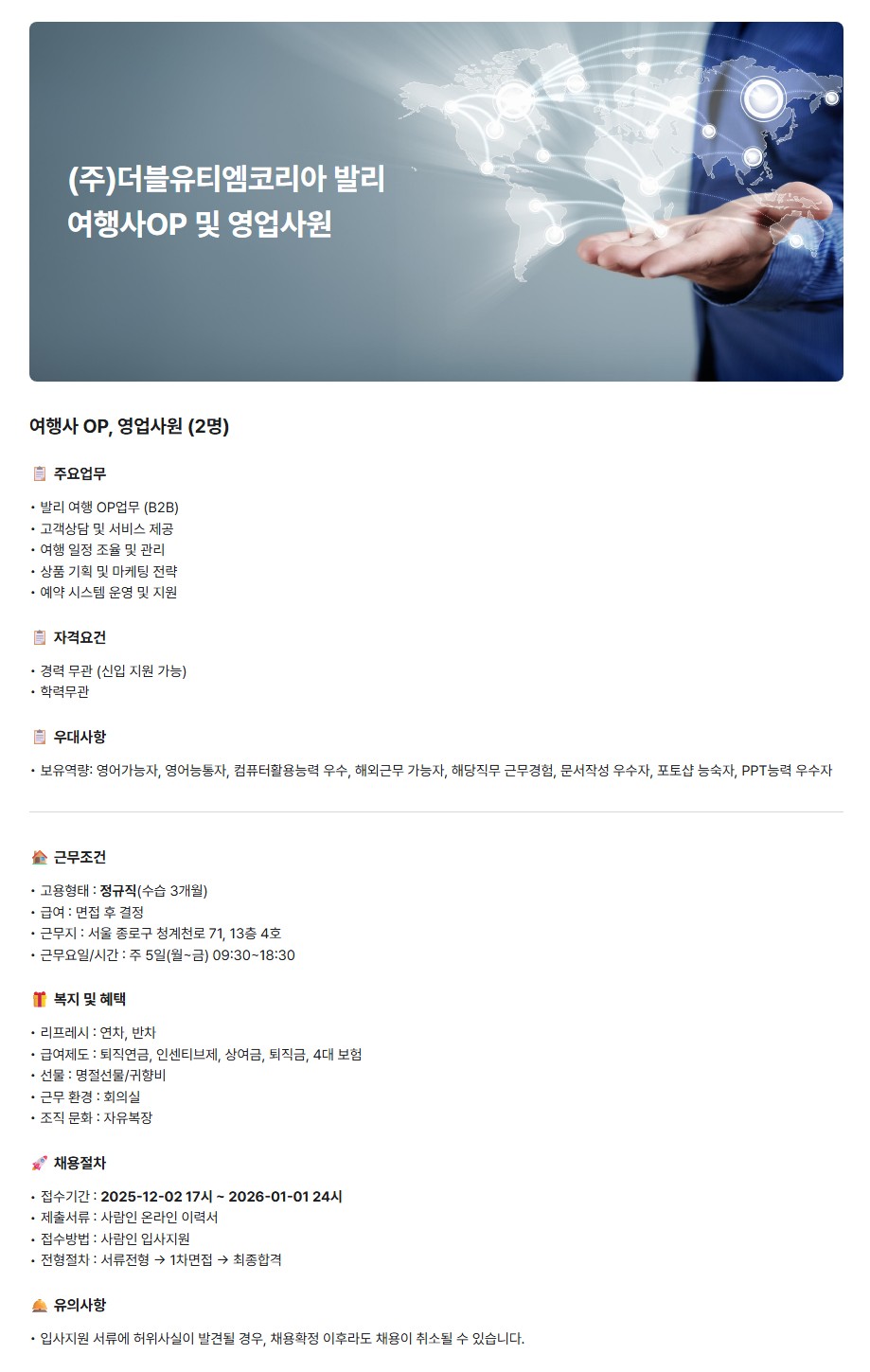 [(주)더블유티엠코리아] 발리 여행사OP 및 영업사원