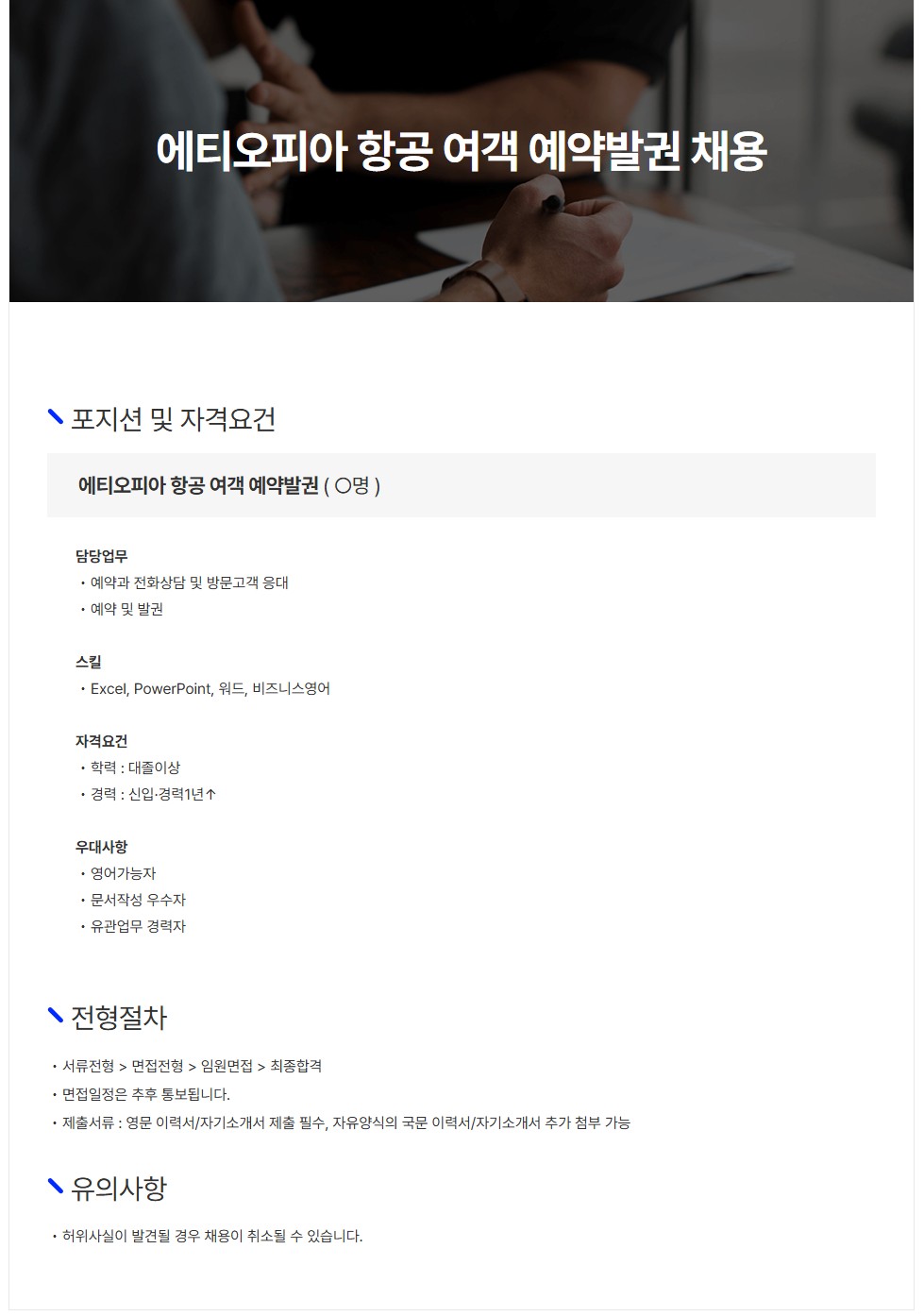 [㈜샤프에비에이션케이] 에티오피아 항공 여객 예약발권 채용