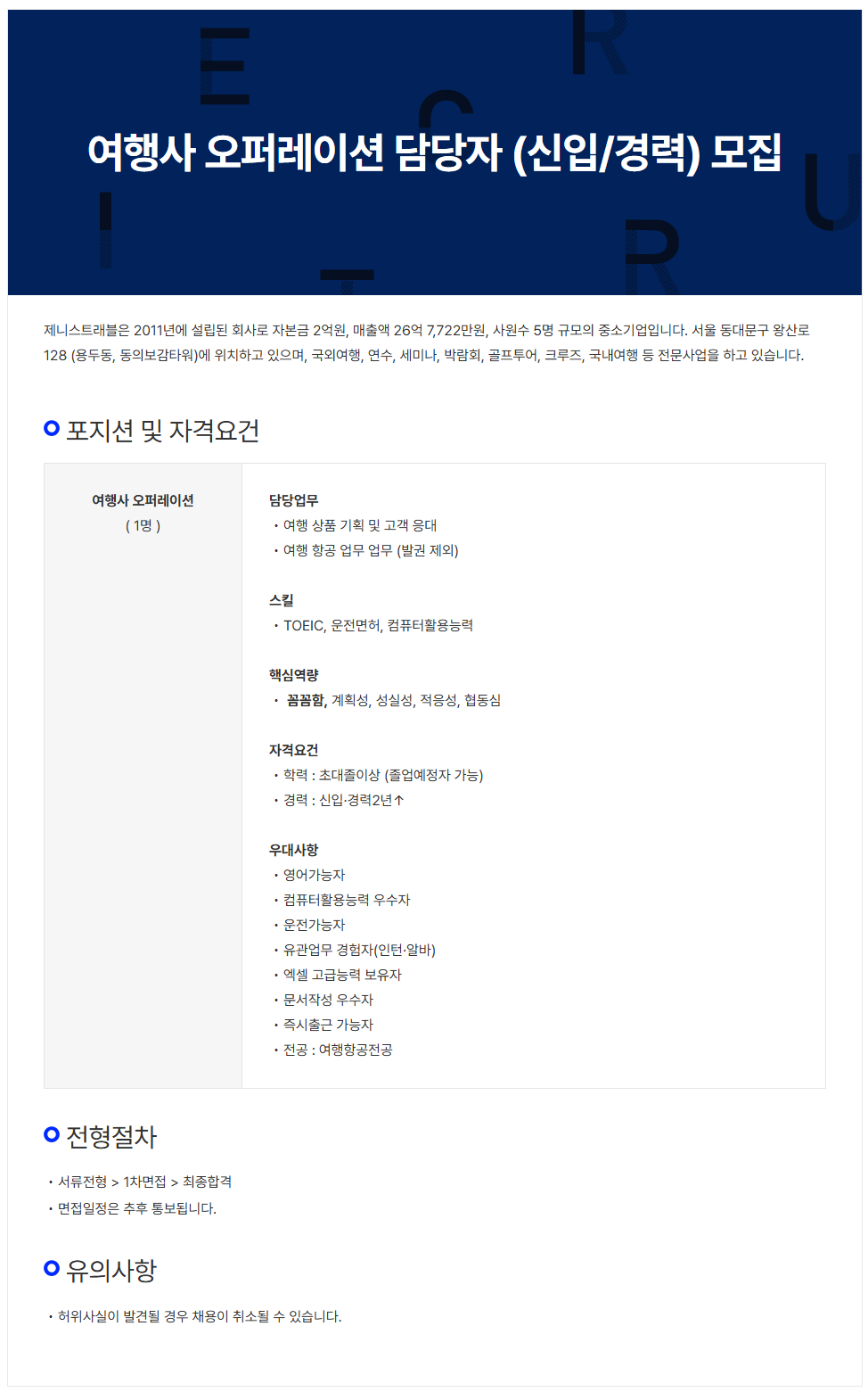 [제니스트래블] 여행사 오퍼레이션 담당자 (신입/경력) 모집