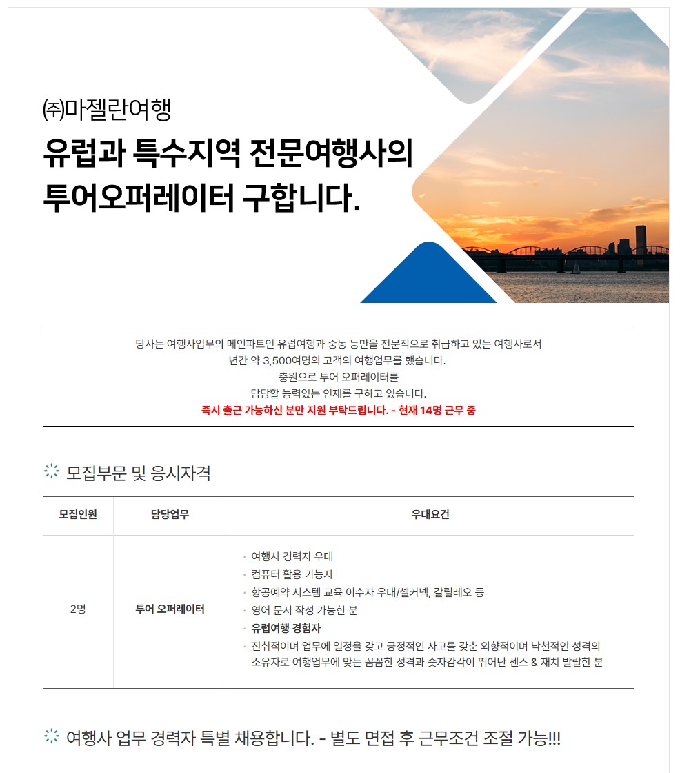 [㈜마젤란여행] 유럽전문여행사에서 유럽여행 경험 있는 사무직 여행업무(서울)