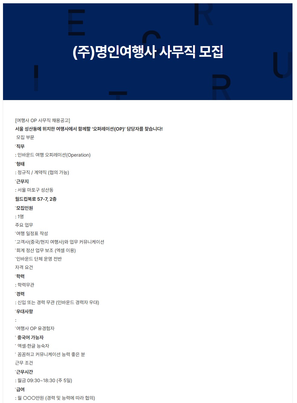 [(주)명인여행사] 명인여행사에서 함께하실 OP 사무직 모집합니다