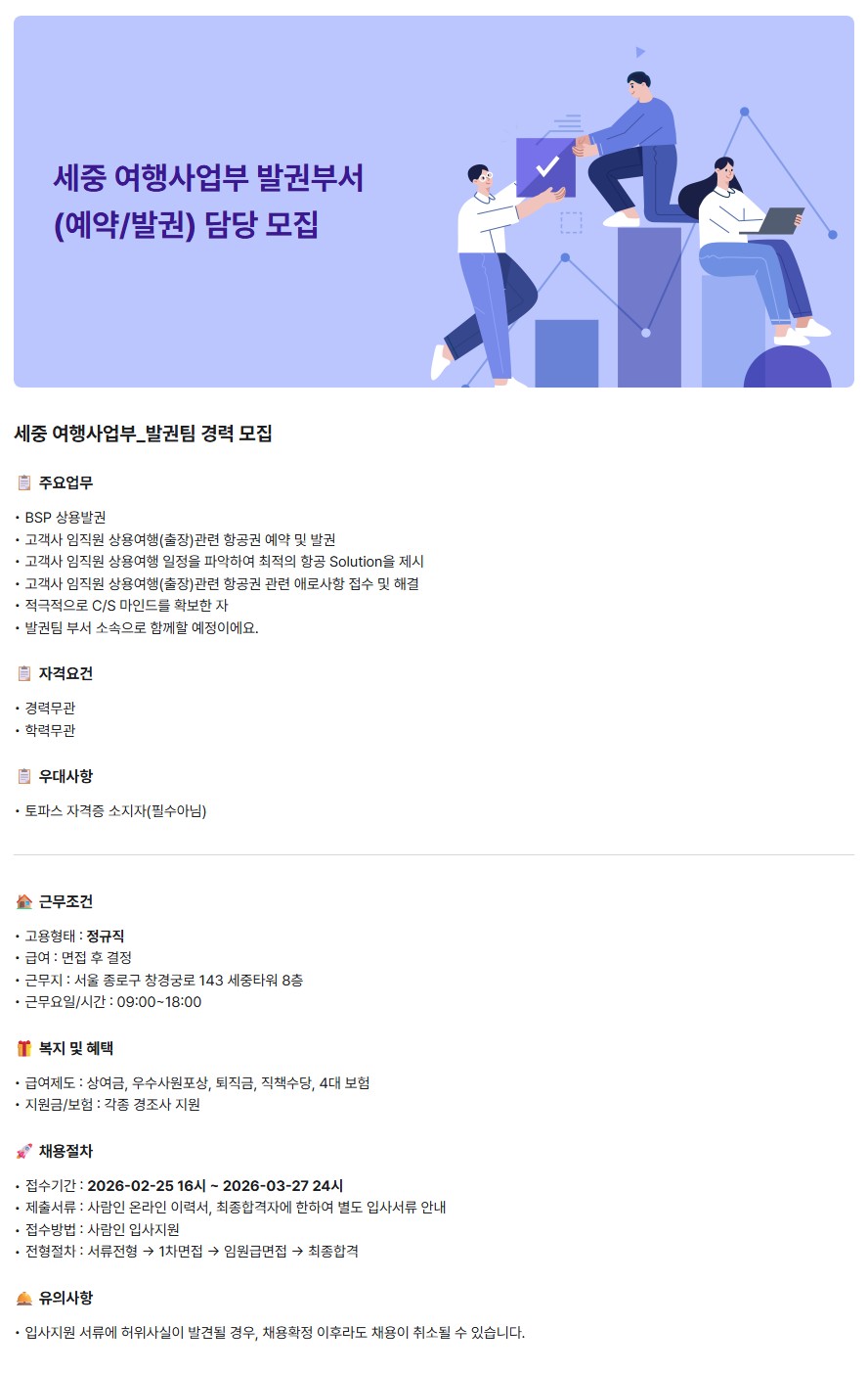 [세중] 여행사업부 - 발권부서(예약/발권) 담당 모집