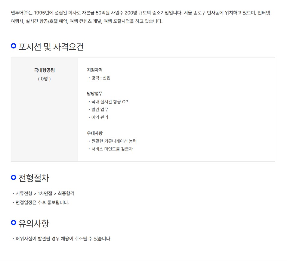 [웹투어㈜] 웹투어 국내사업본부 국내항공팀 OP 채용