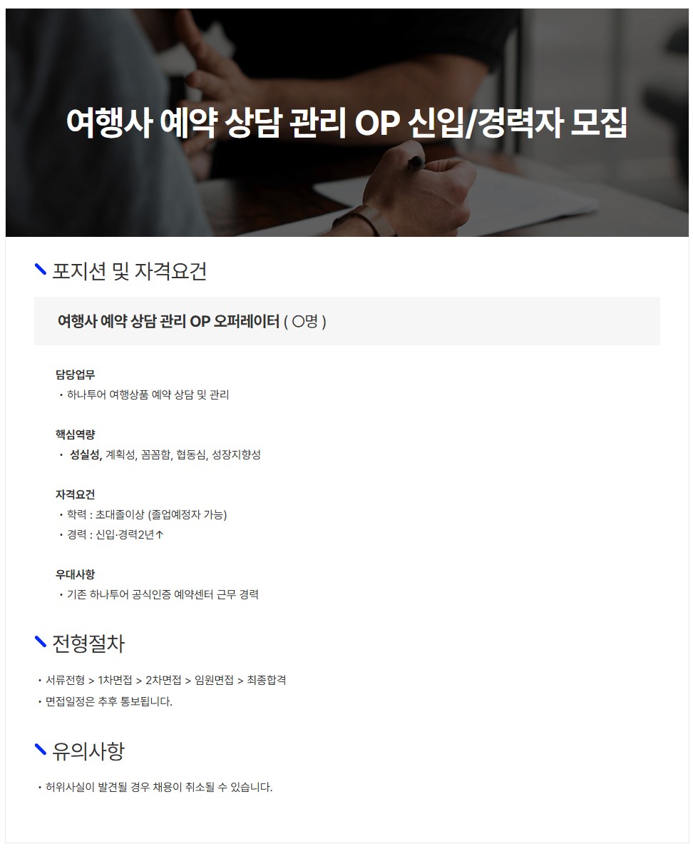 [하나이엔비티] 여행사 예약 상담 관리 OP 신입/경력자 모집