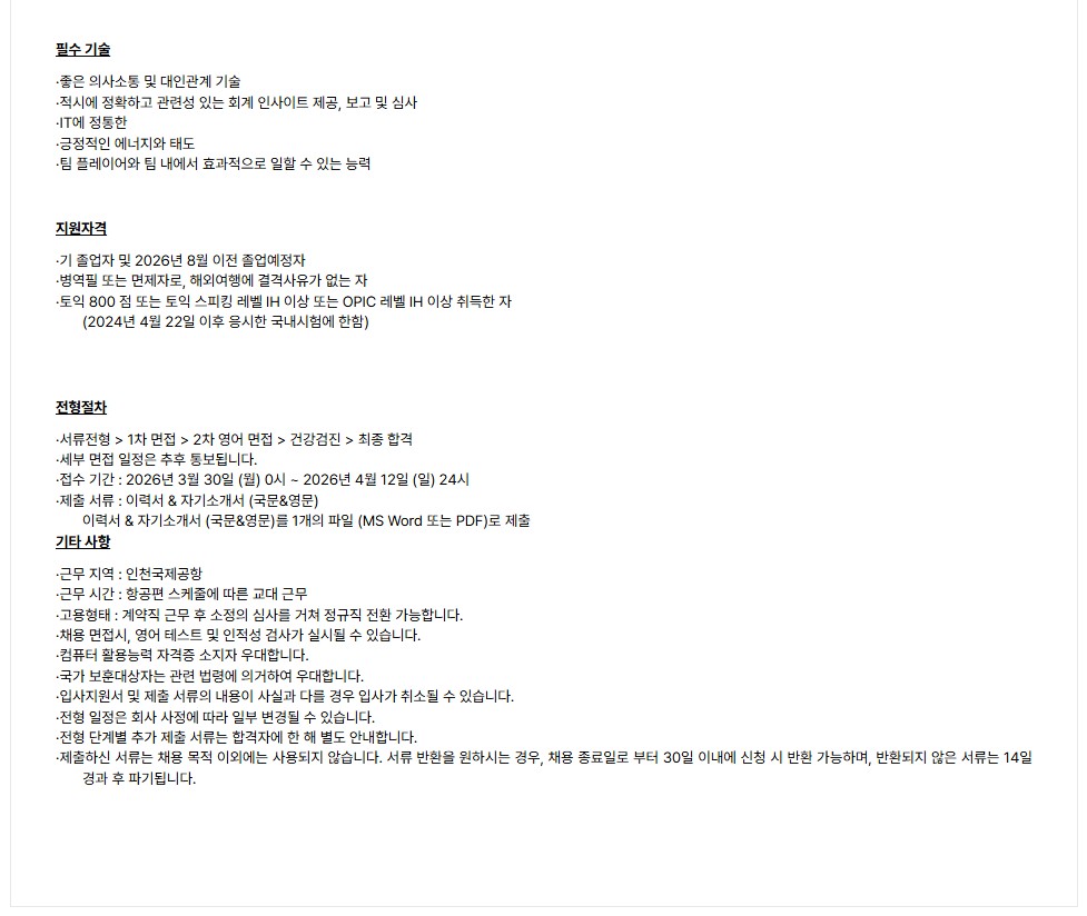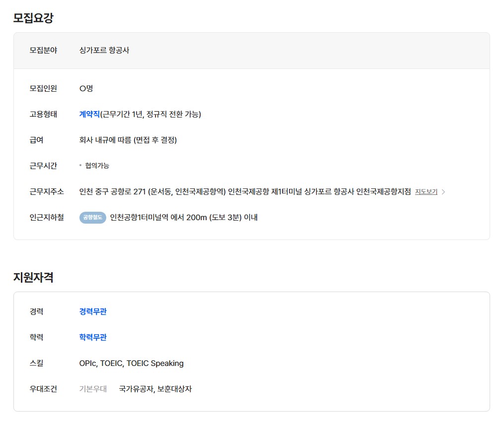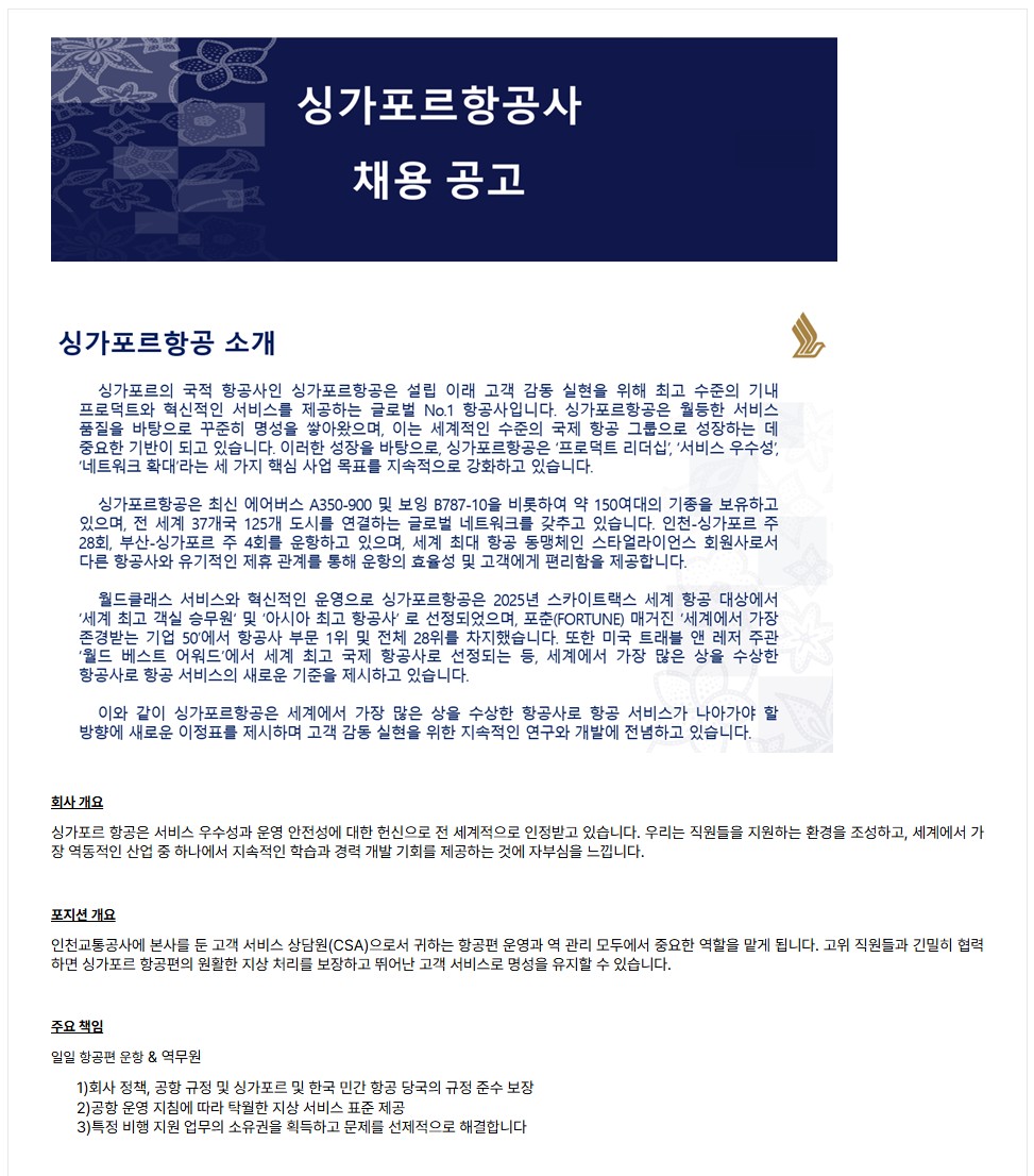 [싱가포르 항공] 인천국제공항지점 여객부 채용 공고