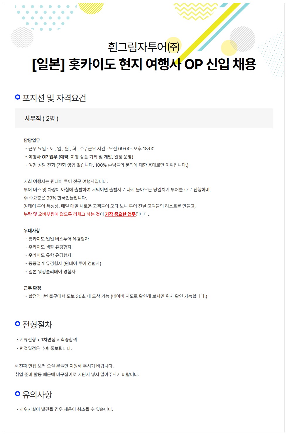 [흰그림자투어㈜] 일본 홋카이도 현지 여행사 OP 신입 채용