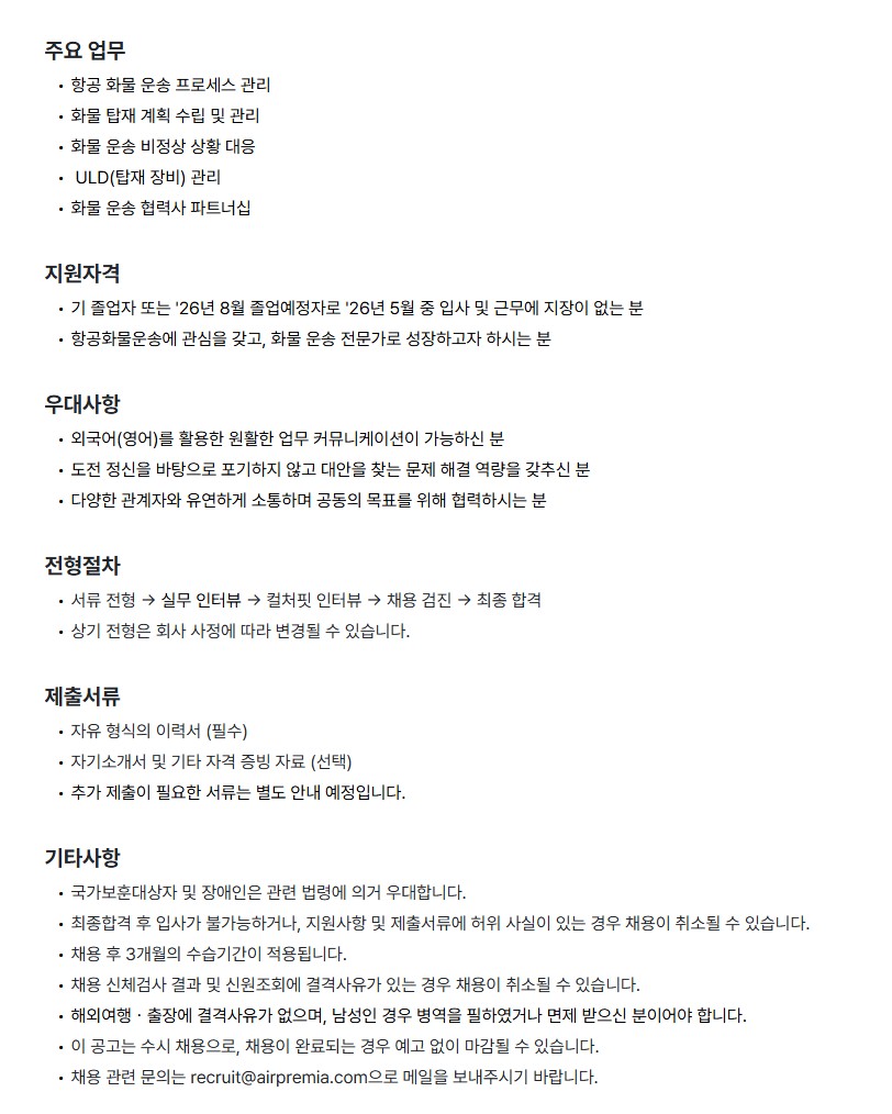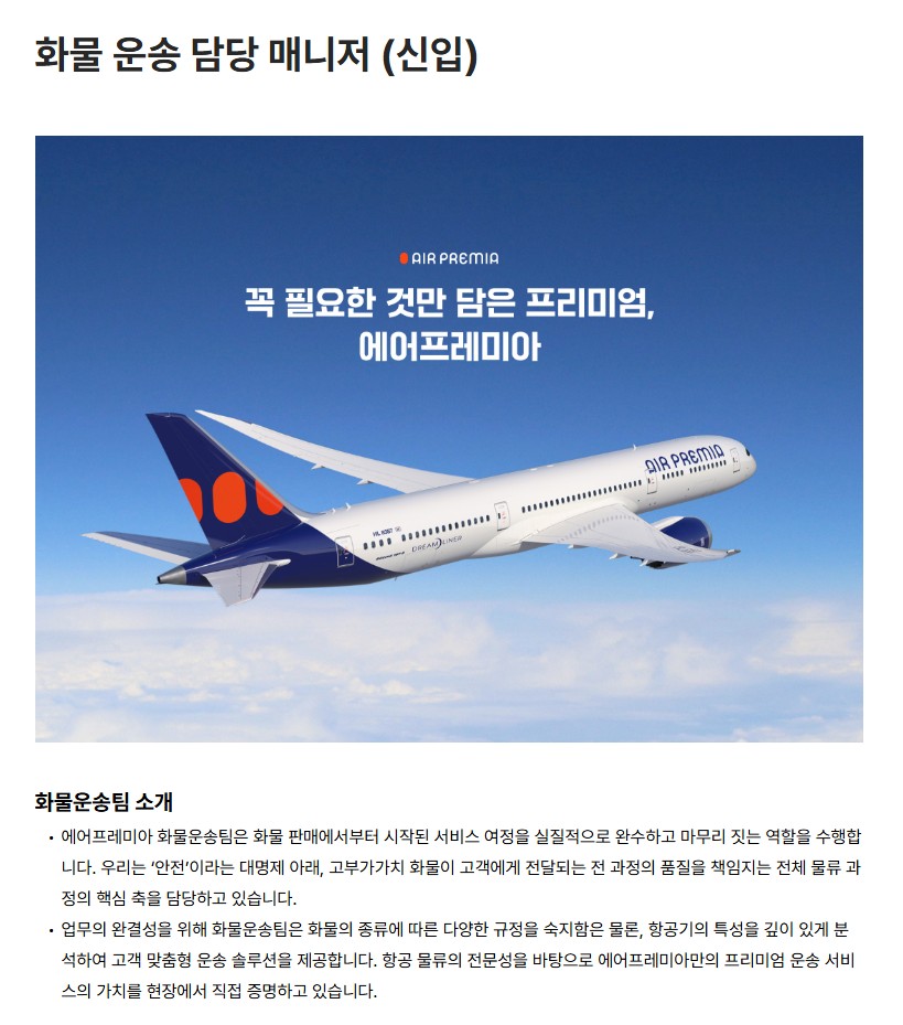 [㈜에어프레미아] 대졸공채 화물운송 담당 매니저(신입)