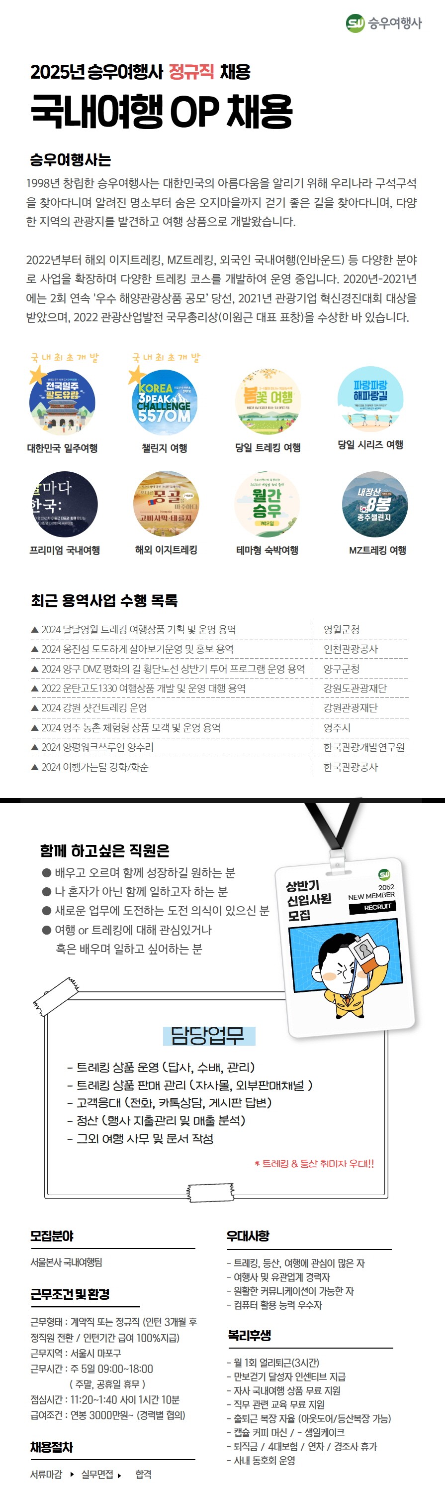 [승우여행사] 트레킹 국내 여행사 OP 신입사원 채용 (여행기획, 여행상담)