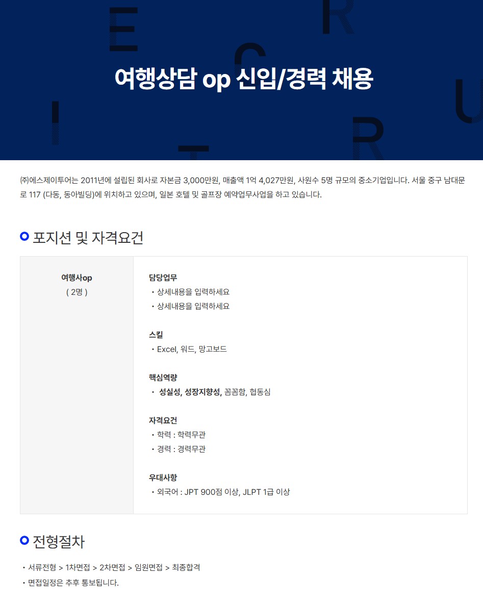 [㈜에스제이투어] 여행상담 op 신입/경력 채용