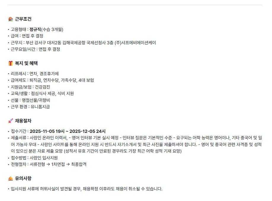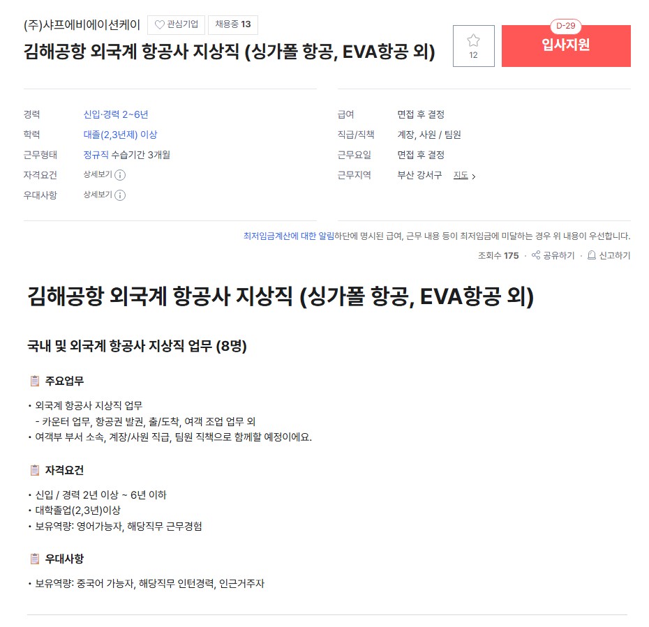 [샤프에비에이션케이] 김해공항 외국계 항공사 지상직 (싱가폴 항공, EVA항공 외)