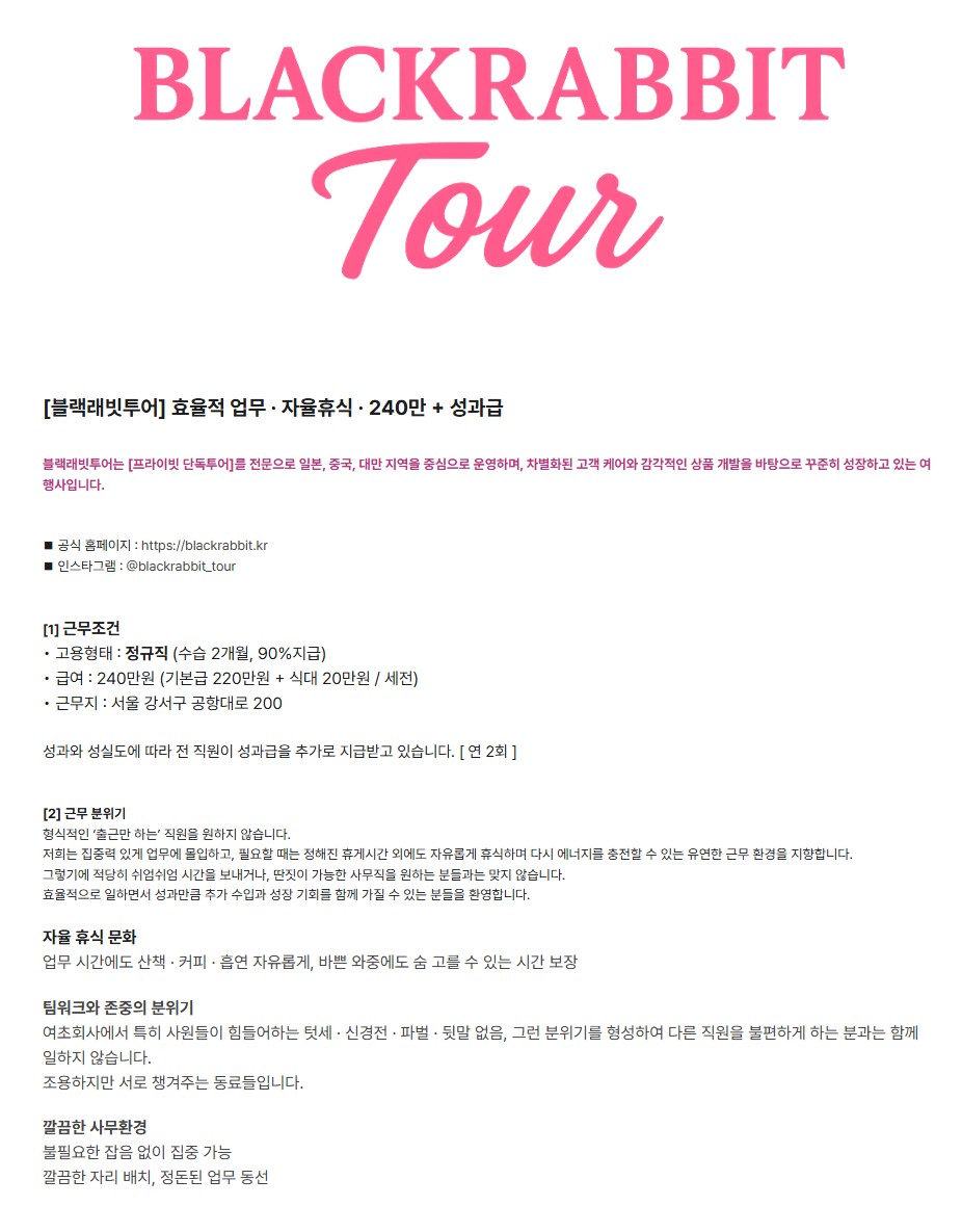 [블랙래빗투어] 240만 + 성과급 해외여행사OP
