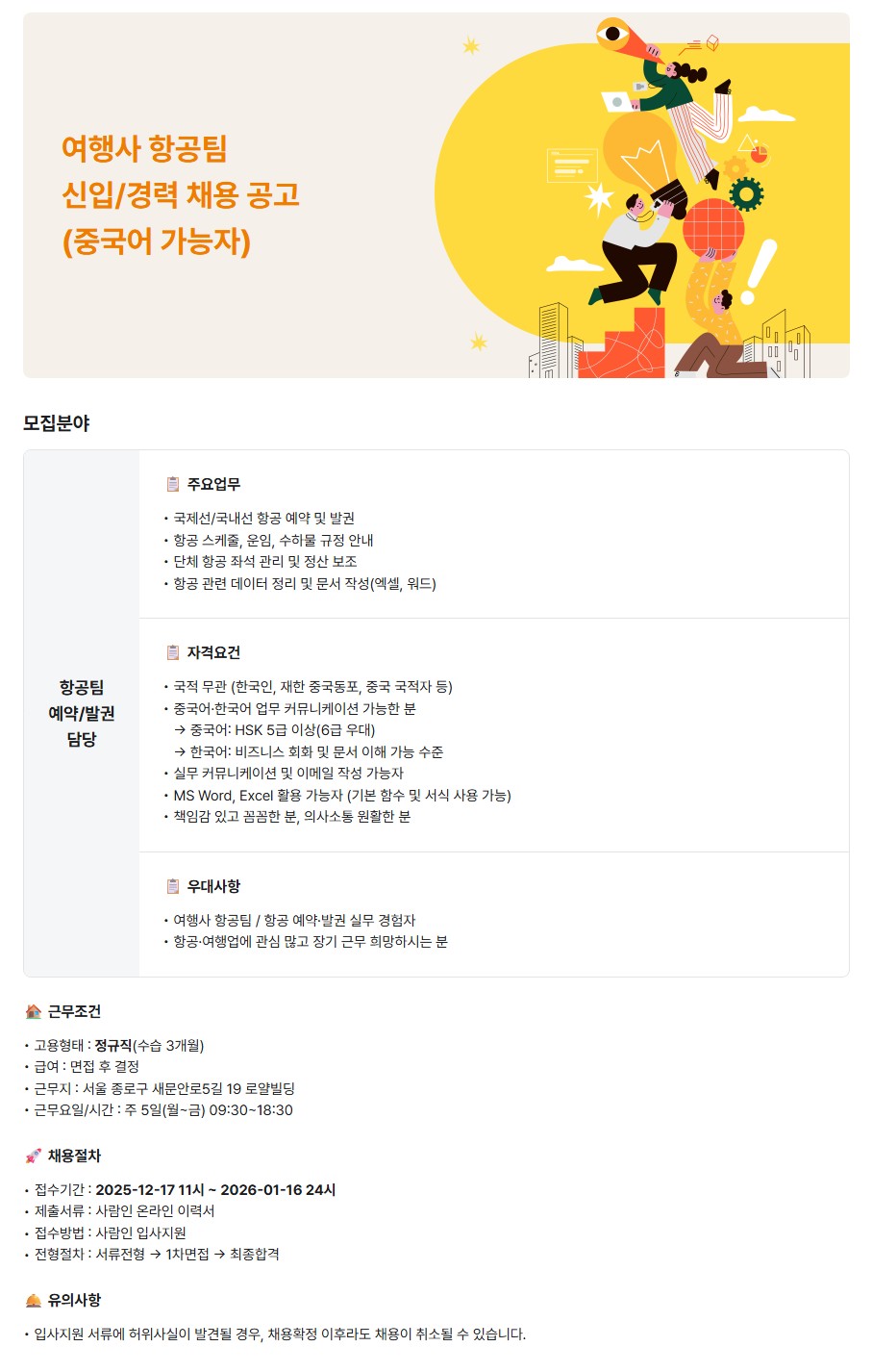 [(주)더에이치큐] 여행사 항공팀 신입/경력 채용 공고 (중국어가능자)