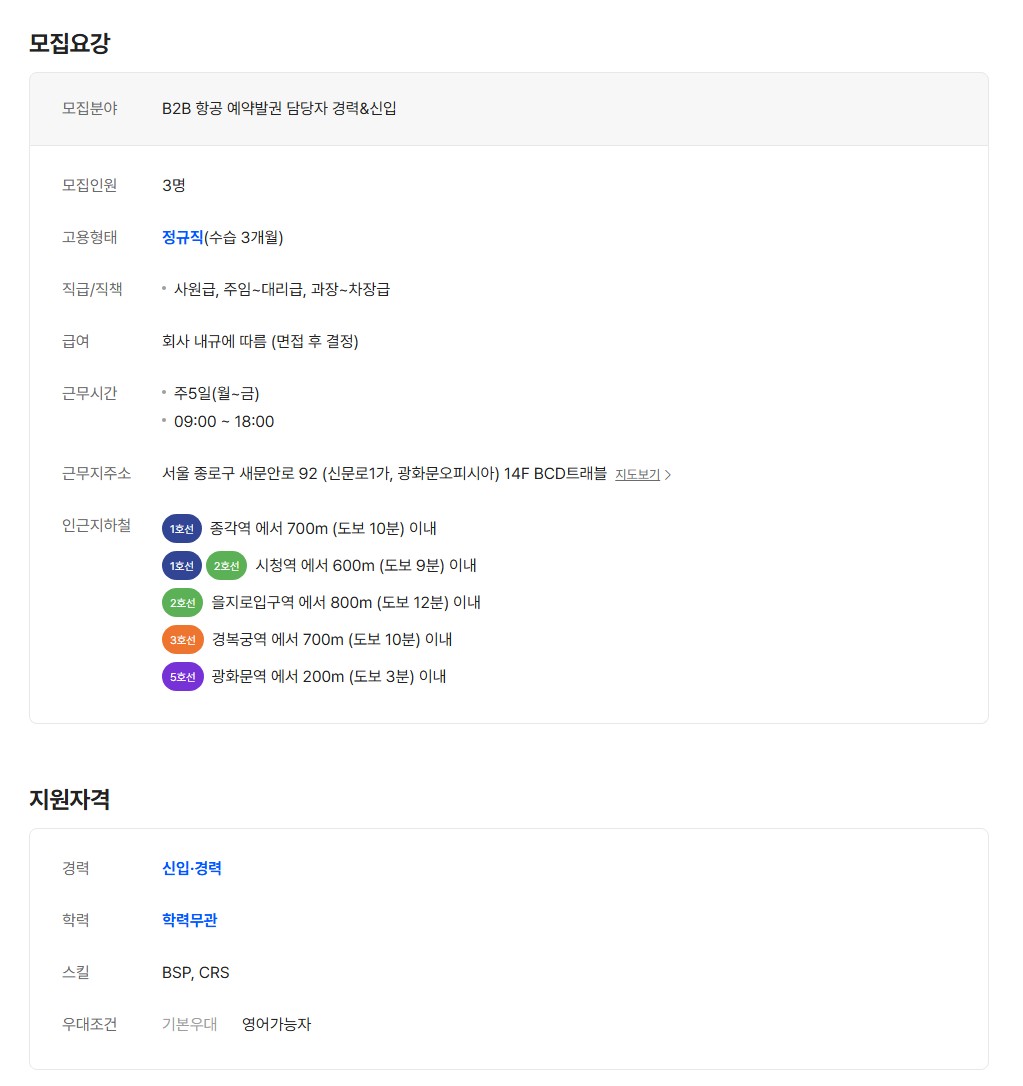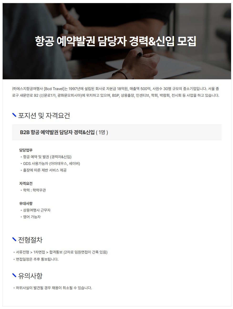 [BCD Travel Korea] 항공 예약발권 담당자 경력&신입 모집
