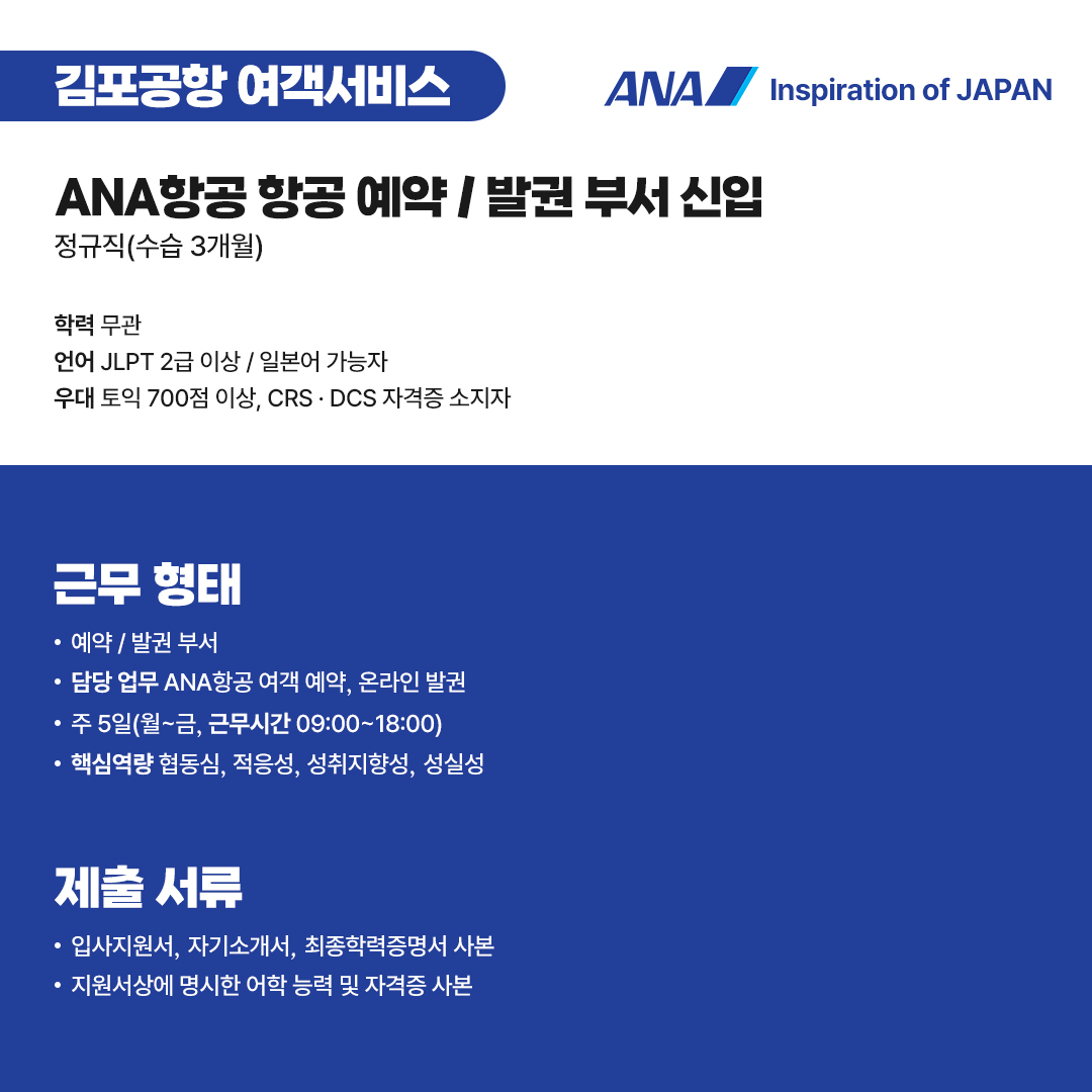 [ANC 정회원 추천채용] ANA항공 항공 예약/발권 부서 신입 지상직 채용