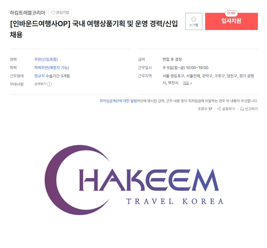 [하킴트래블코리아] 인바운드여행사OP 국내 여행상품기획 및 운영 경력/신입 채용