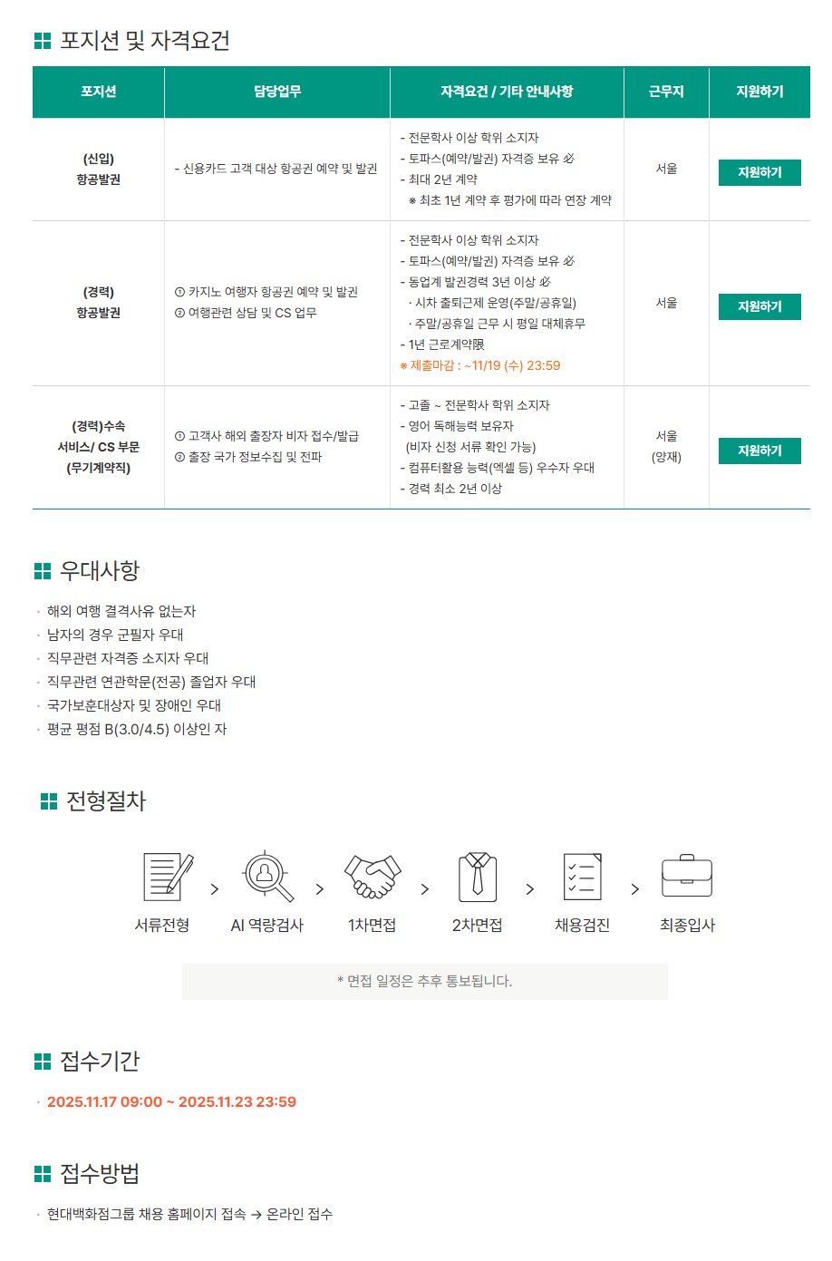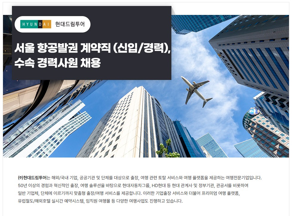 [현대드림투어] 서울 항공발권 계약직 (신입/경력), 수속 경력사원 채용