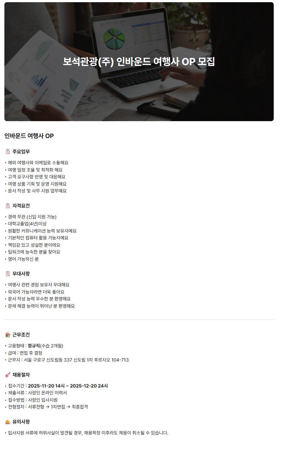 [보석관광(주)] 인바운드 여행사 OP 모집