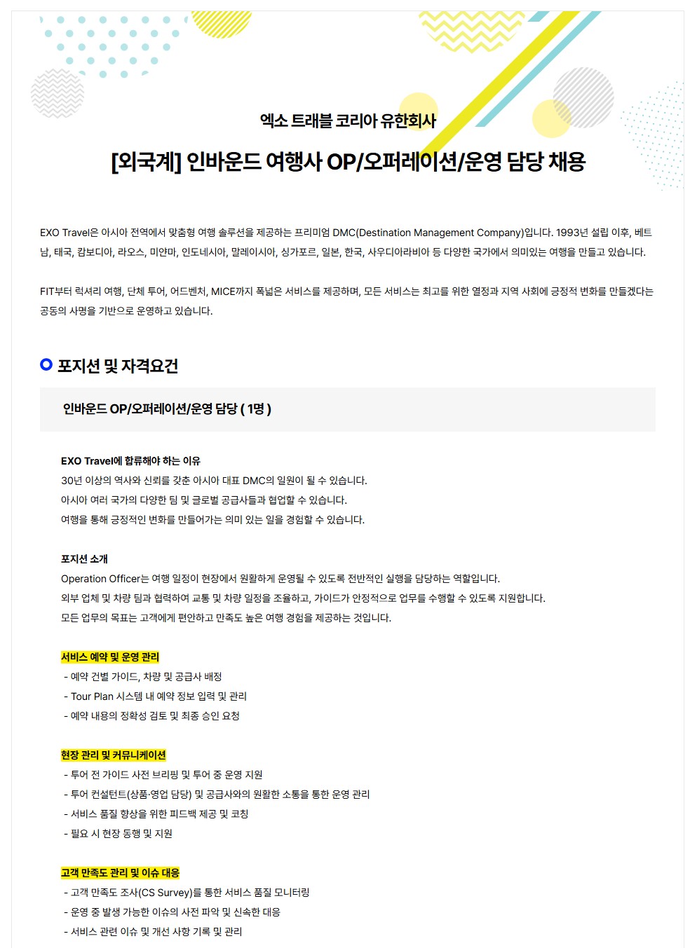 [엑소트래블코리아] 외국계 인바운드 여행사 OP/오퍼레이션/운영 담당 채용