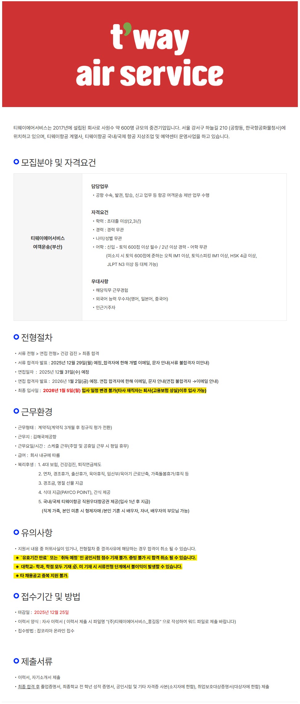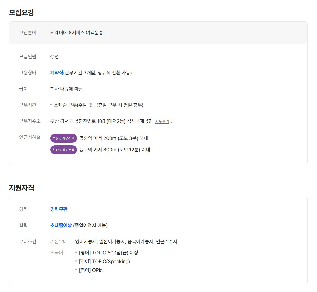 [티웨이항공] 티웨이에어서비스 여객운송직 (부산)