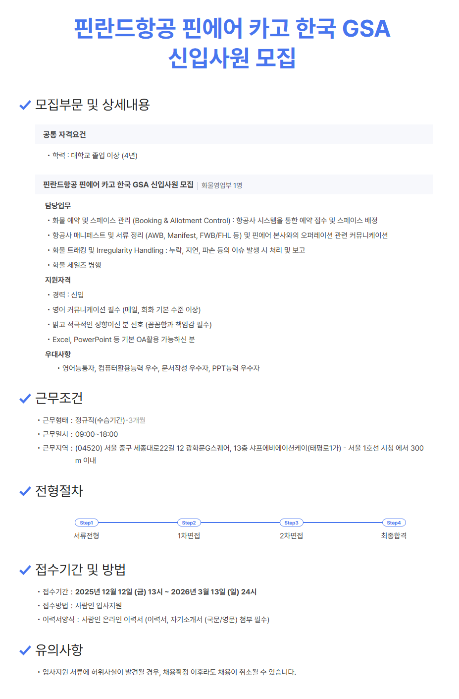 [핀에어] 핀란드항공 카고 한국 GSA 샤프에비에이션 신입사원 모집