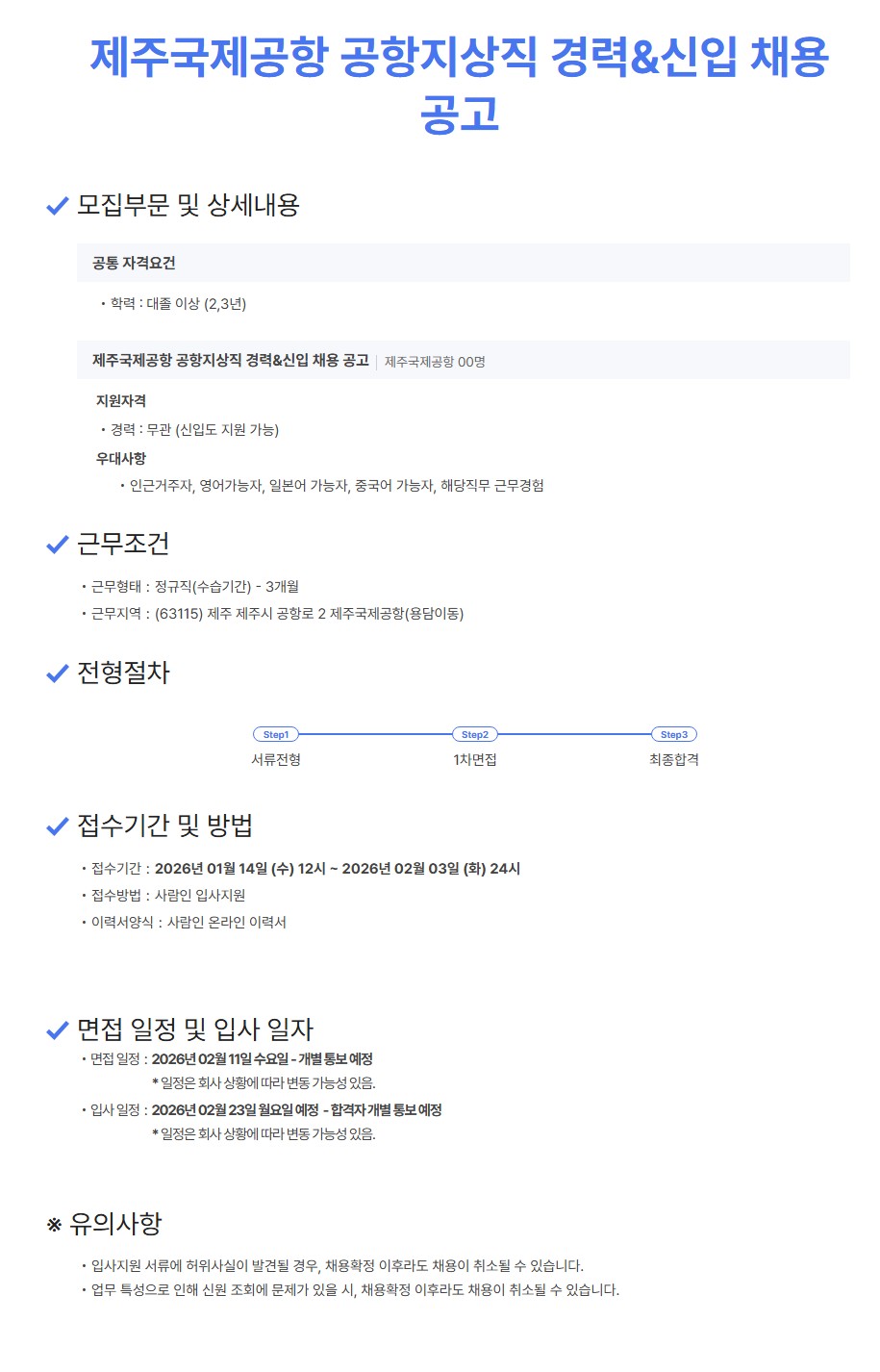 [(주)바스] 제주국제공항 공항지상직 경력&신입 채용 공고
