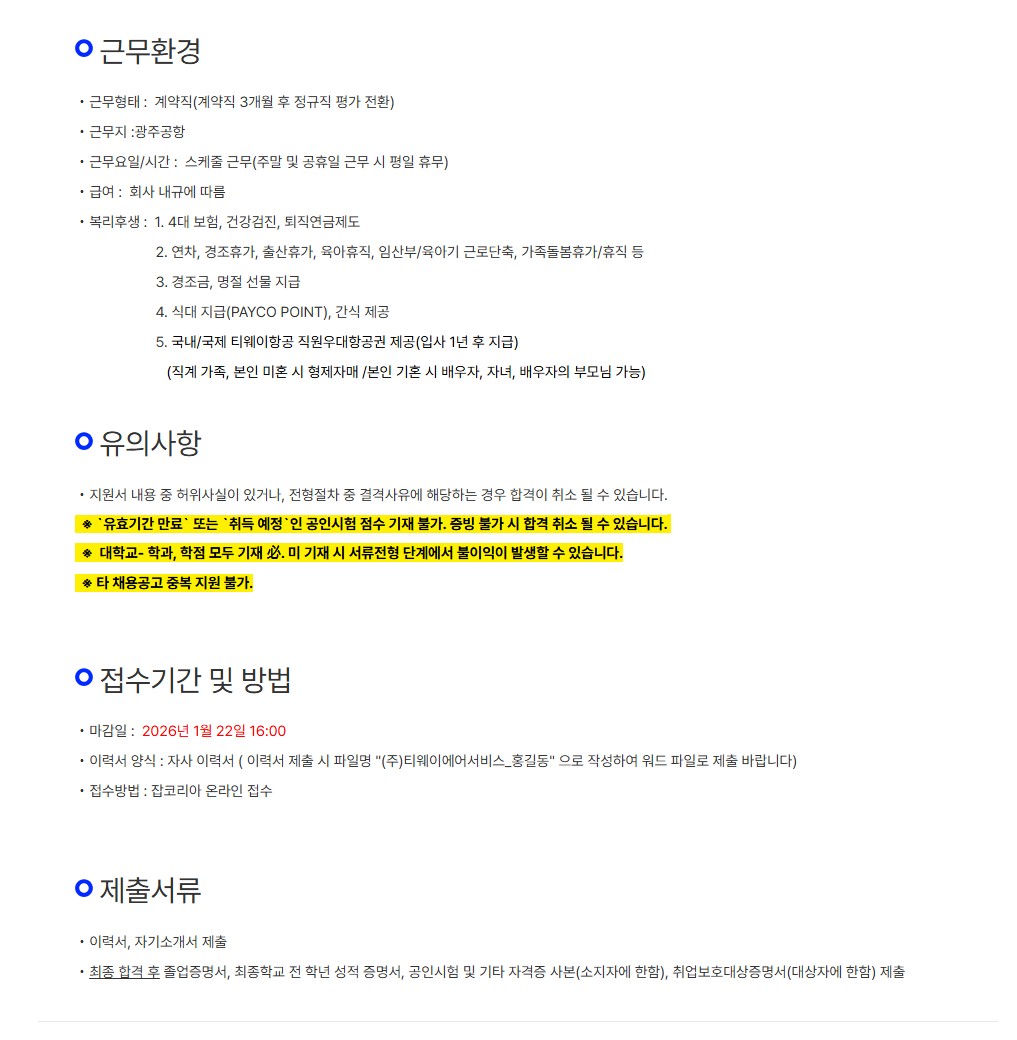 [티웨이항공] 티웨이에어서비스 여객운송직 (광주)