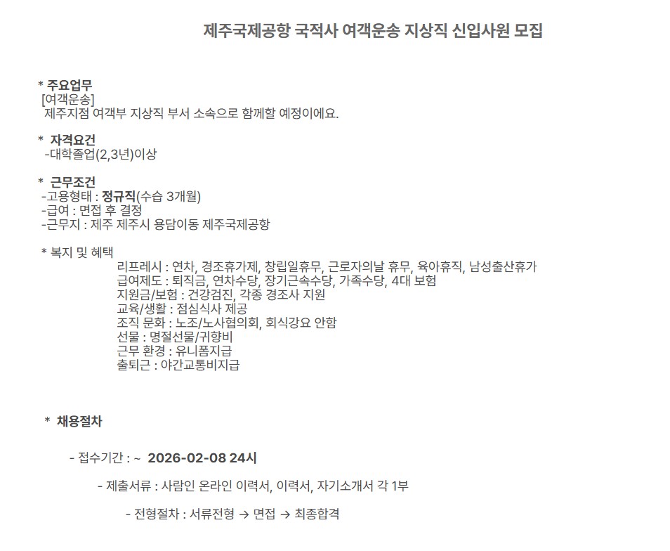 [㈜샤프에비에이션케이] 제주공항 국적사 여객운송 지상직 신입사원 모집