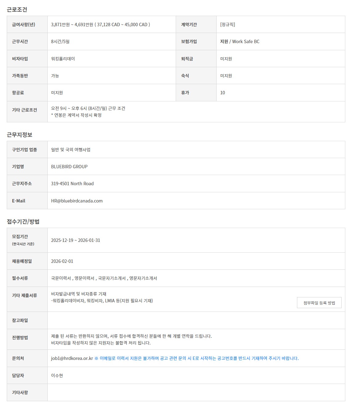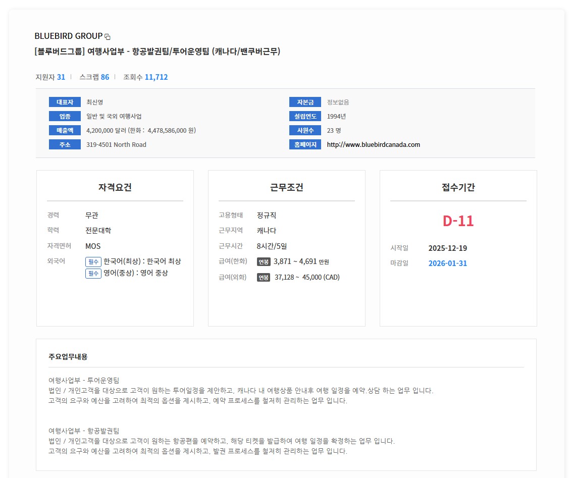 [블루버드그룹] 여행사업부 - 항공발권팀/투어운영팀 (캐나다/밴쿠버근무)-연봉 3,871 ~ 4,691만원