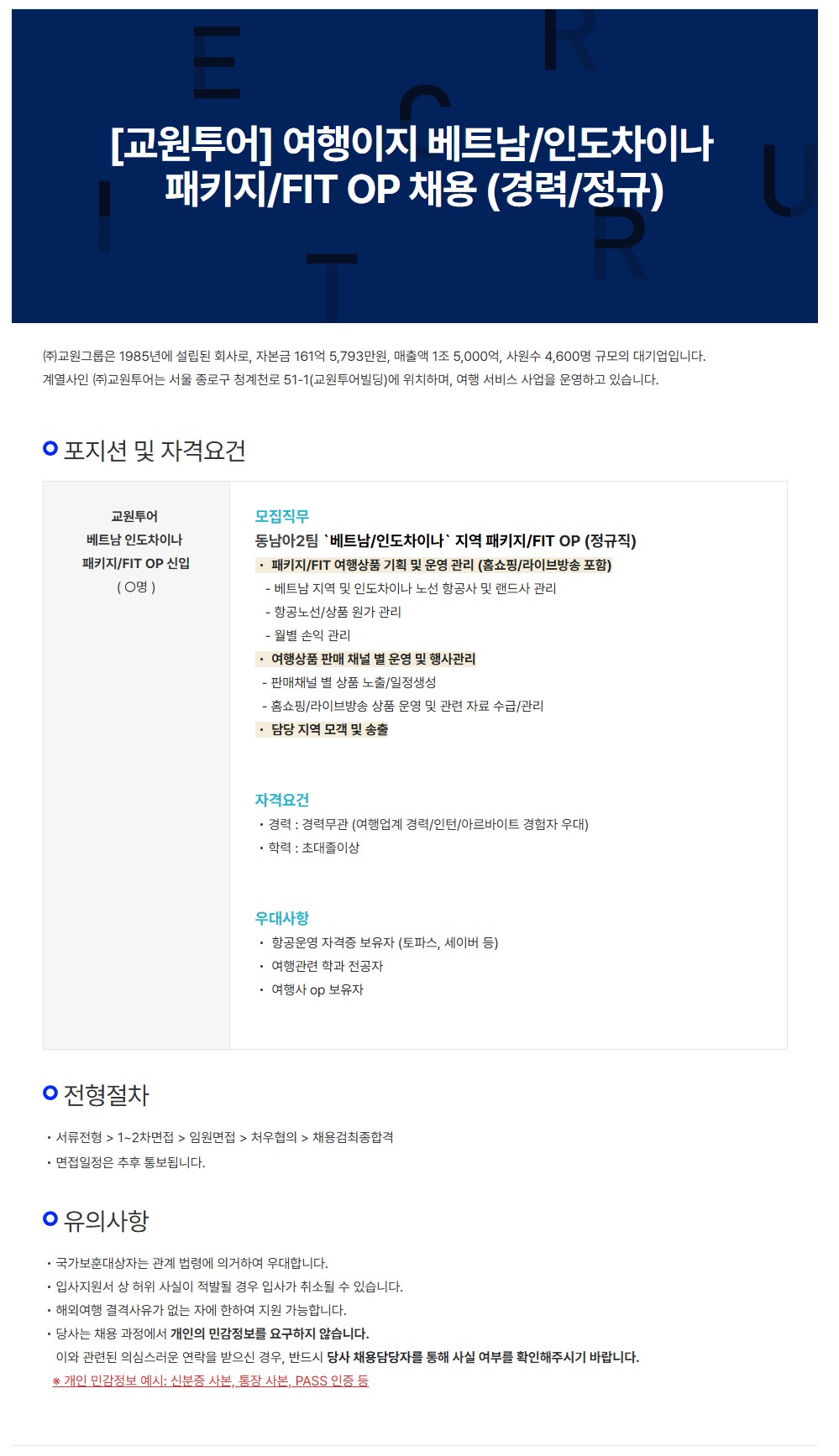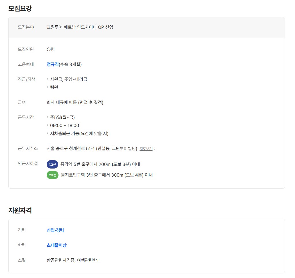 [교원투어] 여행이지 베트남/인도차이나 패키지/FIT OP 채용 (신입/정규)