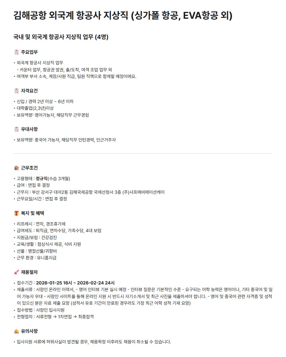 [샤프에비에이션케이] 김해공항 외국계 항공사 지상직 (싱가폴 항공, EVA항공 외)