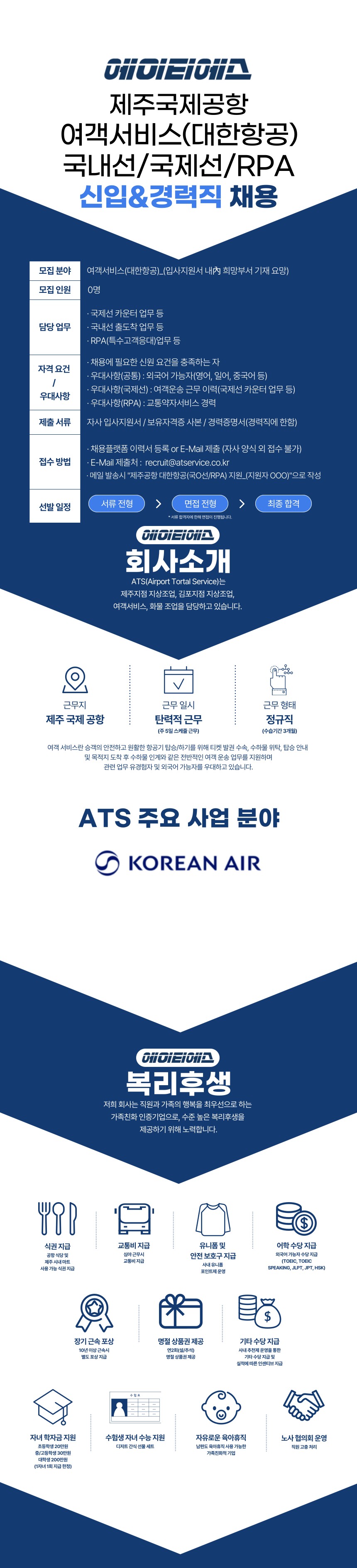 [(주)에이티에스] 제주국제공항 여객운송(대한항공) 지상직 신입&경력 채용