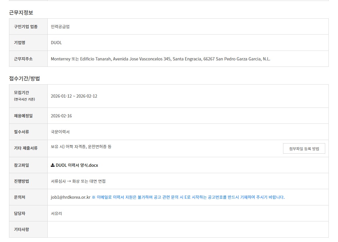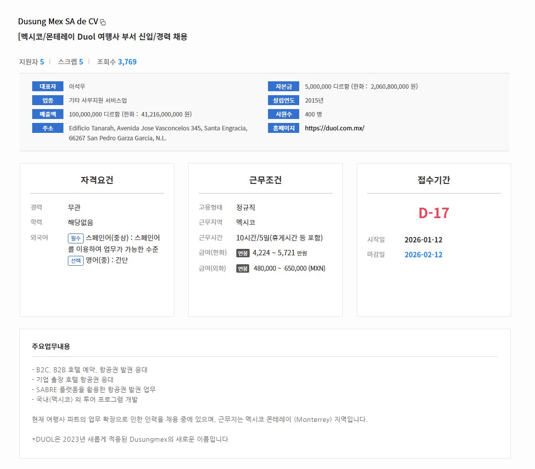 [멕시코/몬테레이] Duol 여행사 부서 신입/경력 채용