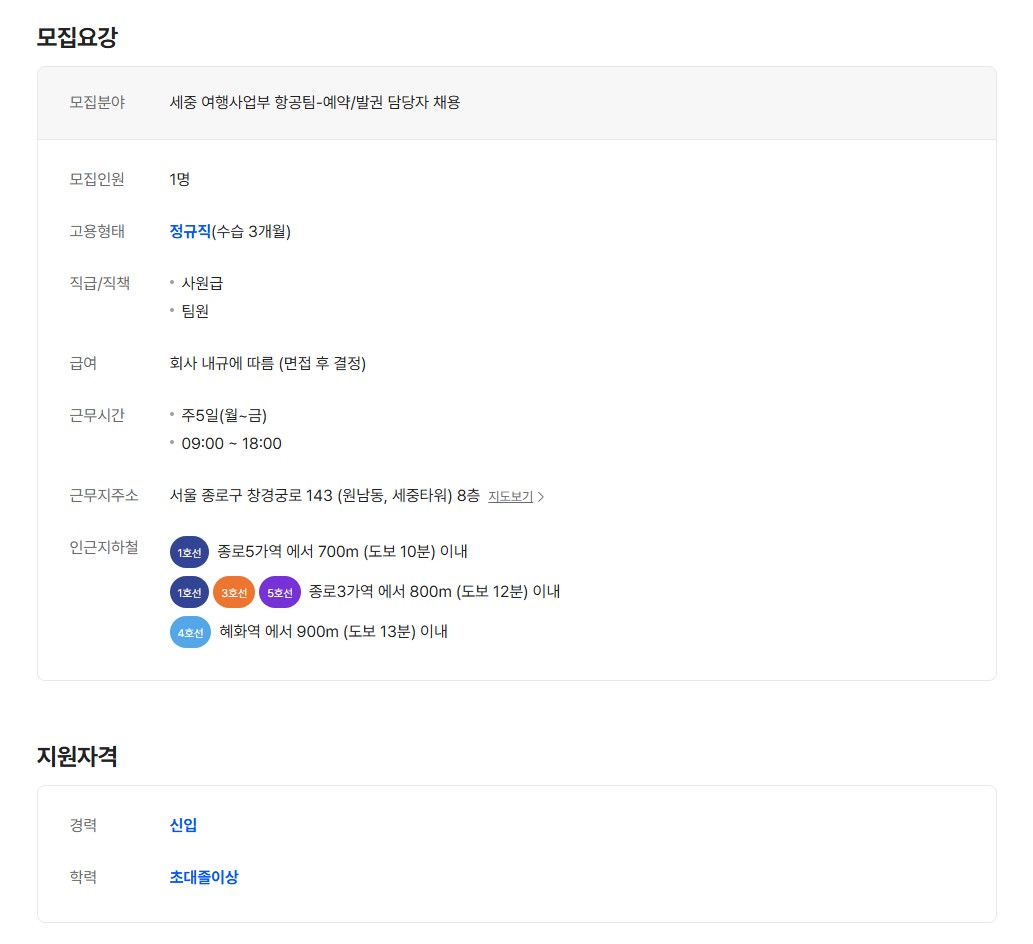 [㈜세중] 세중 여행사업부 - 발권부서(예약/발권) 담당 모집