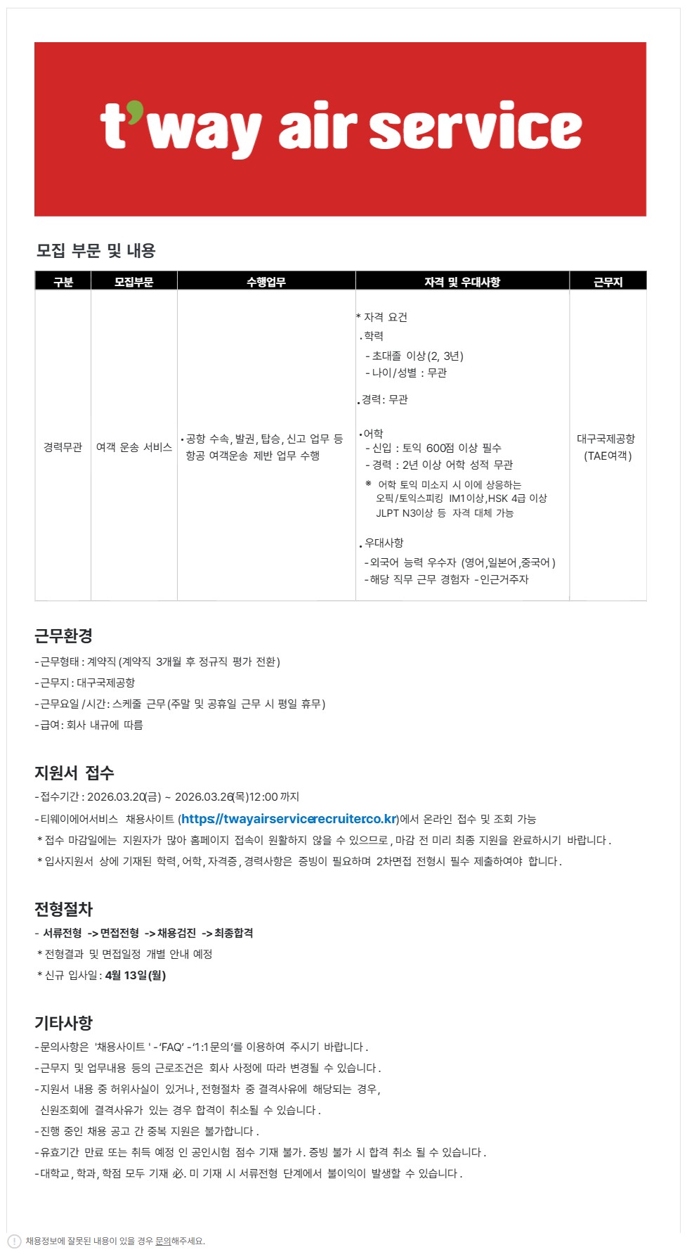 [티웨이항공] (주)티웨이에어서비스 여객운송직 모집 (대구공항)