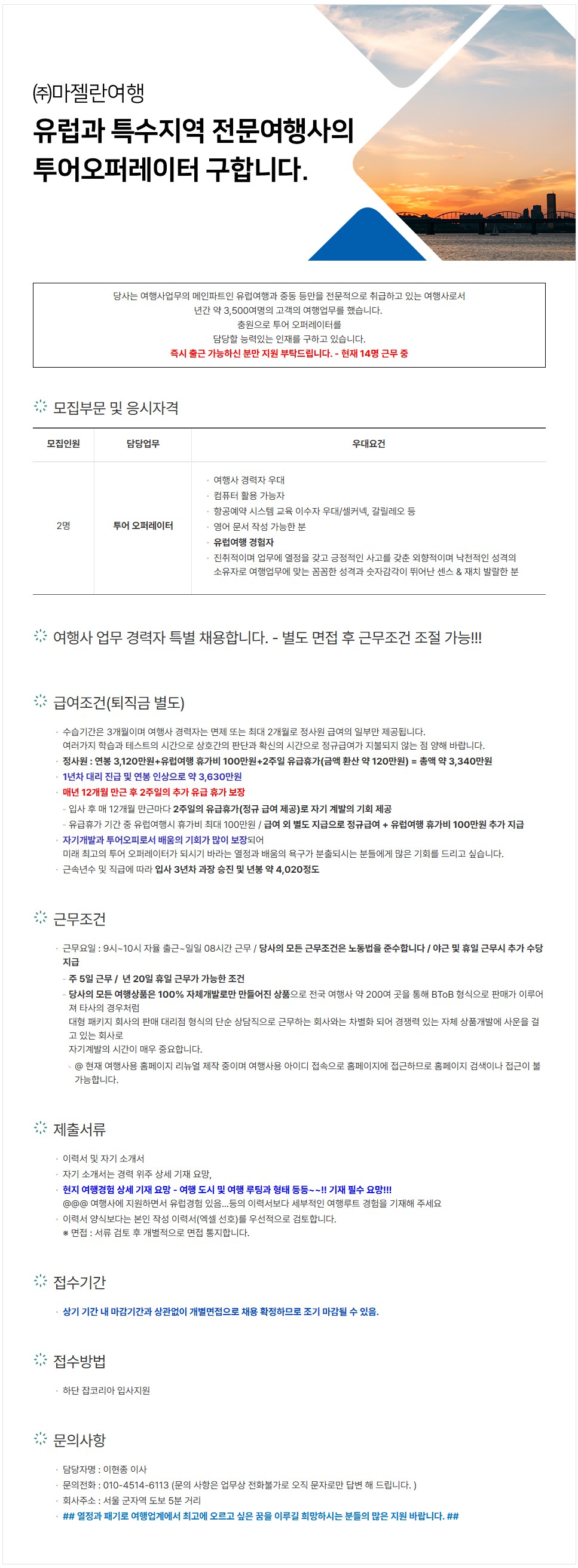 [마젤란여행] 유럽 전문 여행사에서 유럽여행 경험 있는 사무직 여행업무(서울)