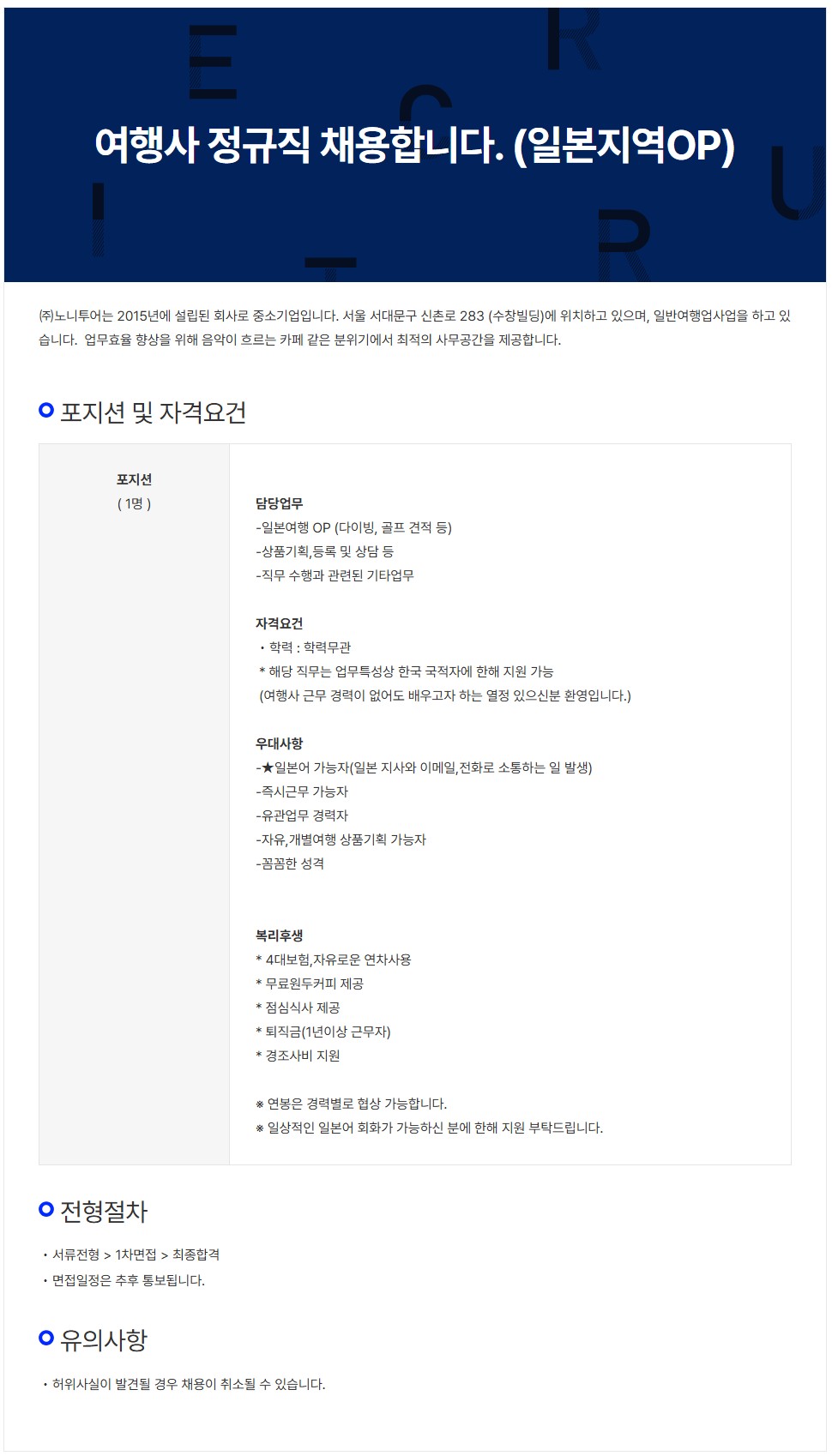 [㈜노니투어]여행사 정규직 채용합니다.(일본지역OP)