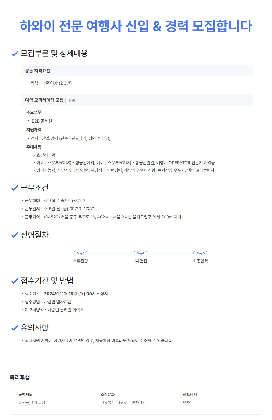 [(주)투어네트글로벌] 하와이 전문 여행사 신입 & 경력직 모집합니다