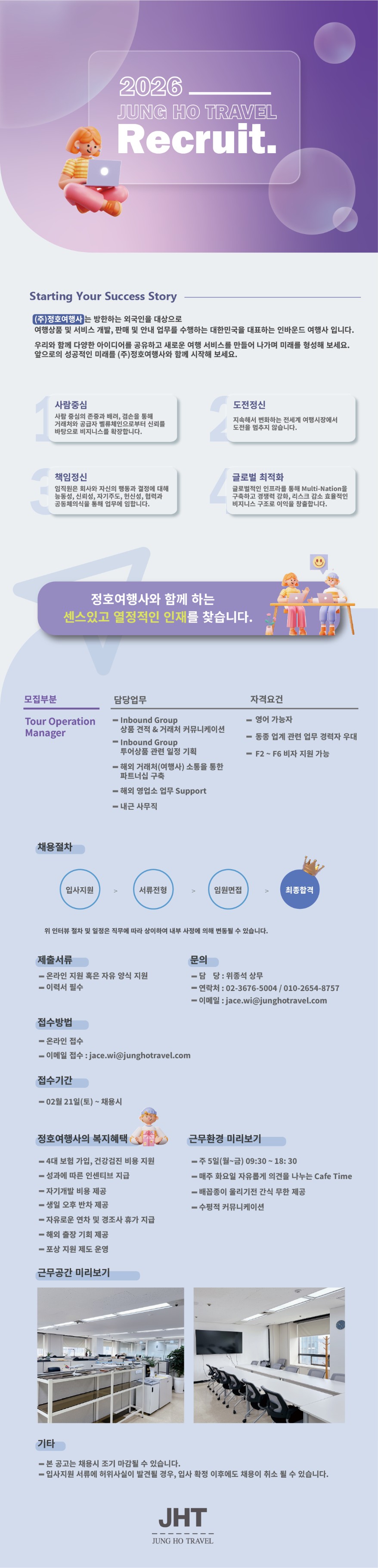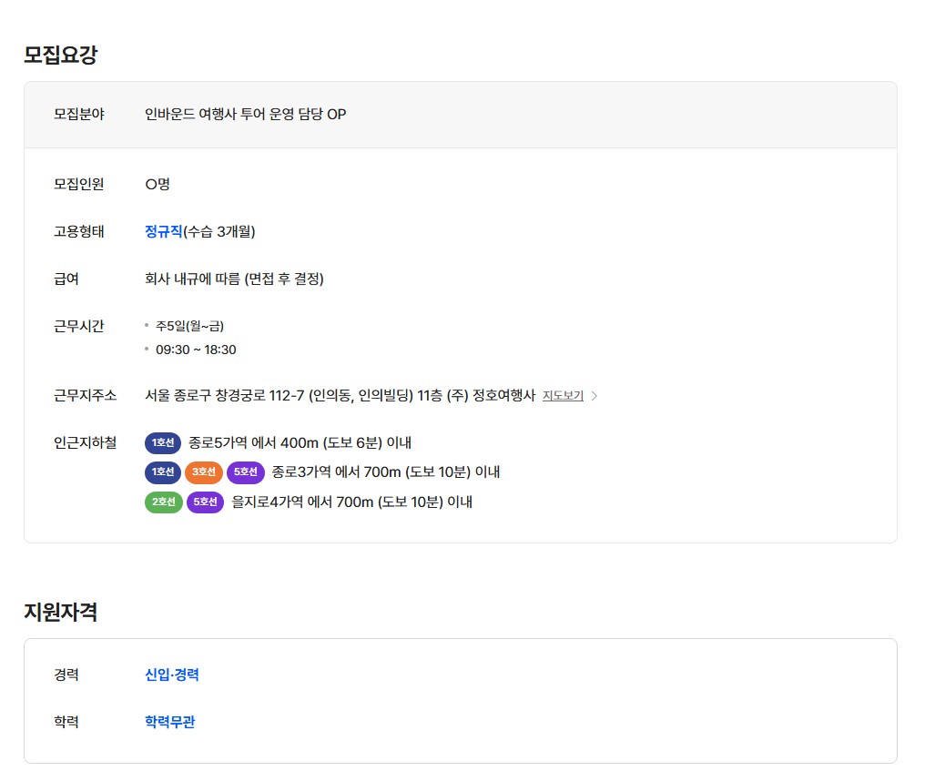 [정호여행사] 인바운드 투어 운영 담당 OP 경력 및 신입 채용