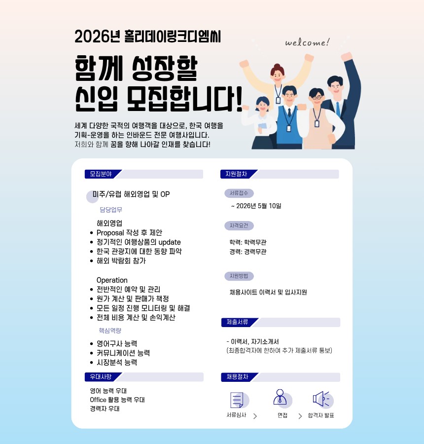 [㈜홀리데이링크DMC] 신입 인바운드 여행사 영어권 해외영업 및 OP