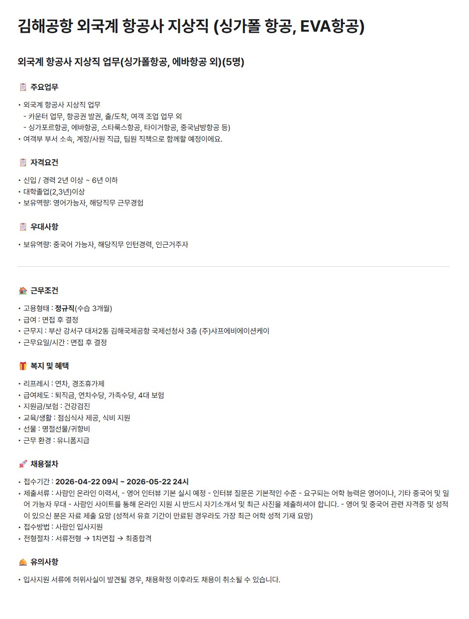 [샤프에비에이션케이] 김해공항 외국계 항공사 지상직 (싱가폴 항공, EVA항공)