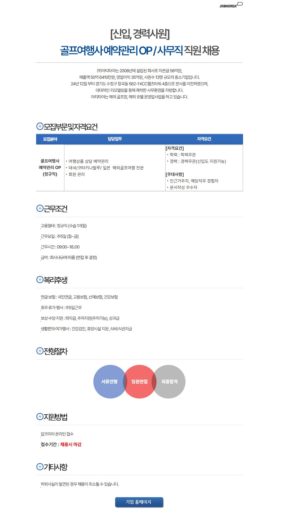 [(주)아티타야] 골프여행사 예약 관리 OP(신입, 경력사원 채용)