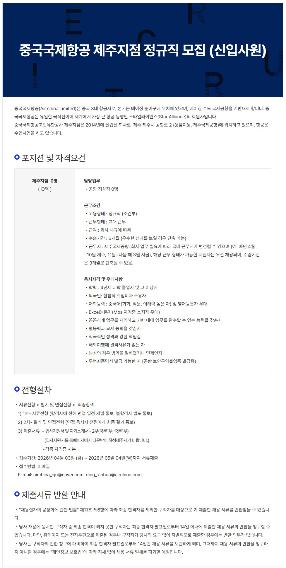 중국국제항공 제주지점 정규직 모집 (신입사원)